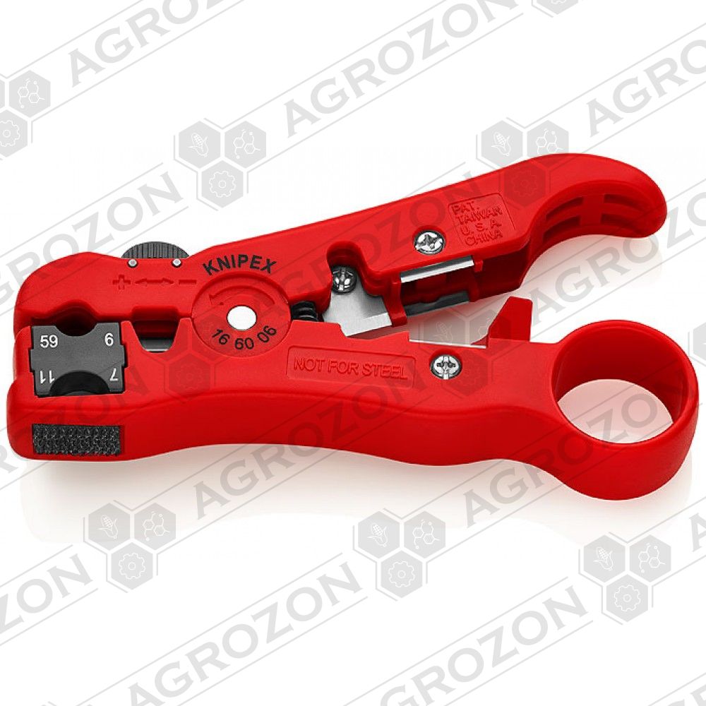 Інструмент для видалення ізоляції з коаксіального та дата-кабелю KNIPEX 16 60 06 SB Універсальний інструмент для видалення ізоляції з коаксіального кабелю RG 59, RG 6, RG 7, RG 11 для видалення зовнішньої оболонки, екрану та ізоляції за один робочий хід лезо для зняття ізоляції з дата-кабелю, з юстируванням два леза для різання та видалення оболонки з плоского телефонного кабелю (4P/6P/8P) за один робочий хід запресовані леза для різання дата-кабелю корпус: пластик протиударний