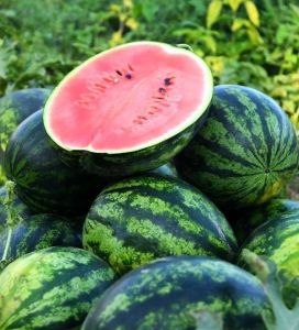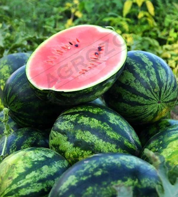 Плід: округлої форми, вага - 6-8 кг, однорідні, шкірка смугаста, блискуча, м'якоть насиченого червоного кольору, хрустка, солодка