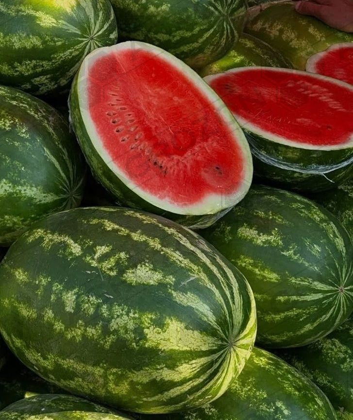 Плід: округлої форми, вага - 6-8 кг, однорідні, шкірка смугаста, блискуча, м'якоть насиченого темно-червоного кольору, хрустка