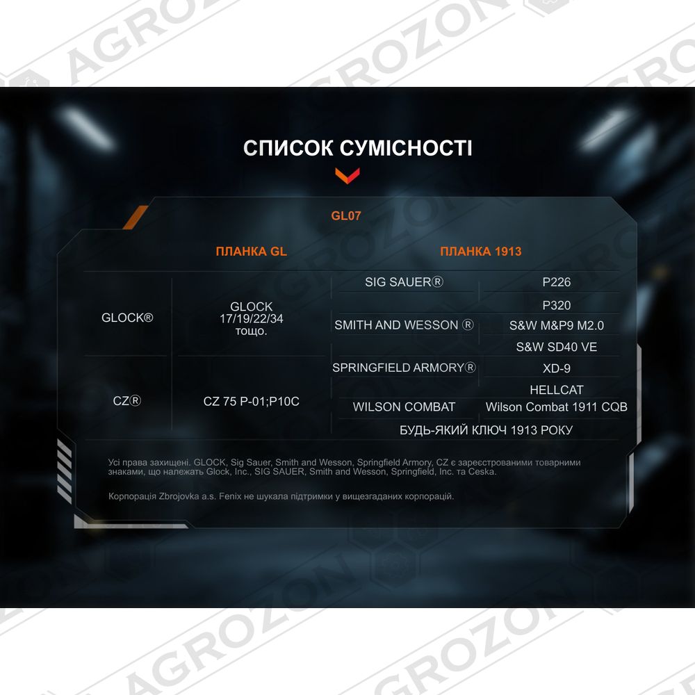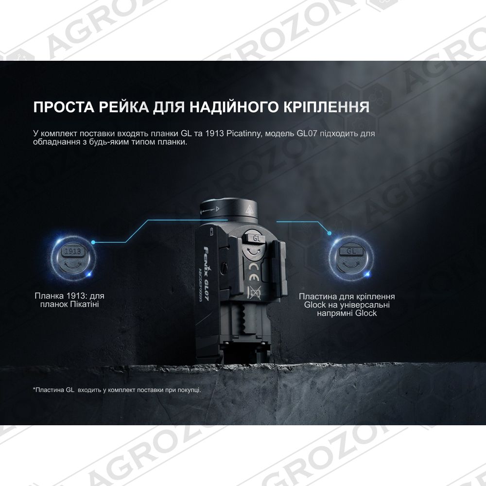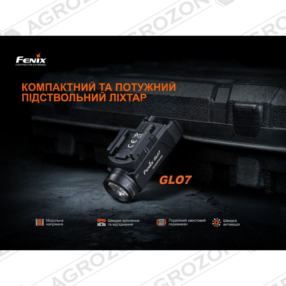 Ліхтар Fenix GL07 оснащений універсальним швидкознімним кріпленням, сумісним з планками Glock та Picatinny. Модульна база з рухомими напрямними дозволяє швидко адаптувати положення пристрою під різні моделі зброї — від повнорозмірних до компактних пістолетів, таких як Springfield Hellcat.