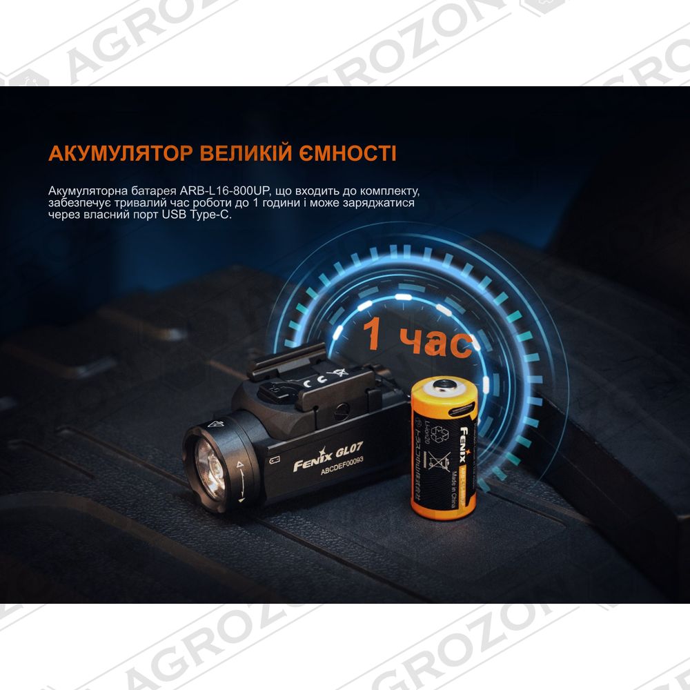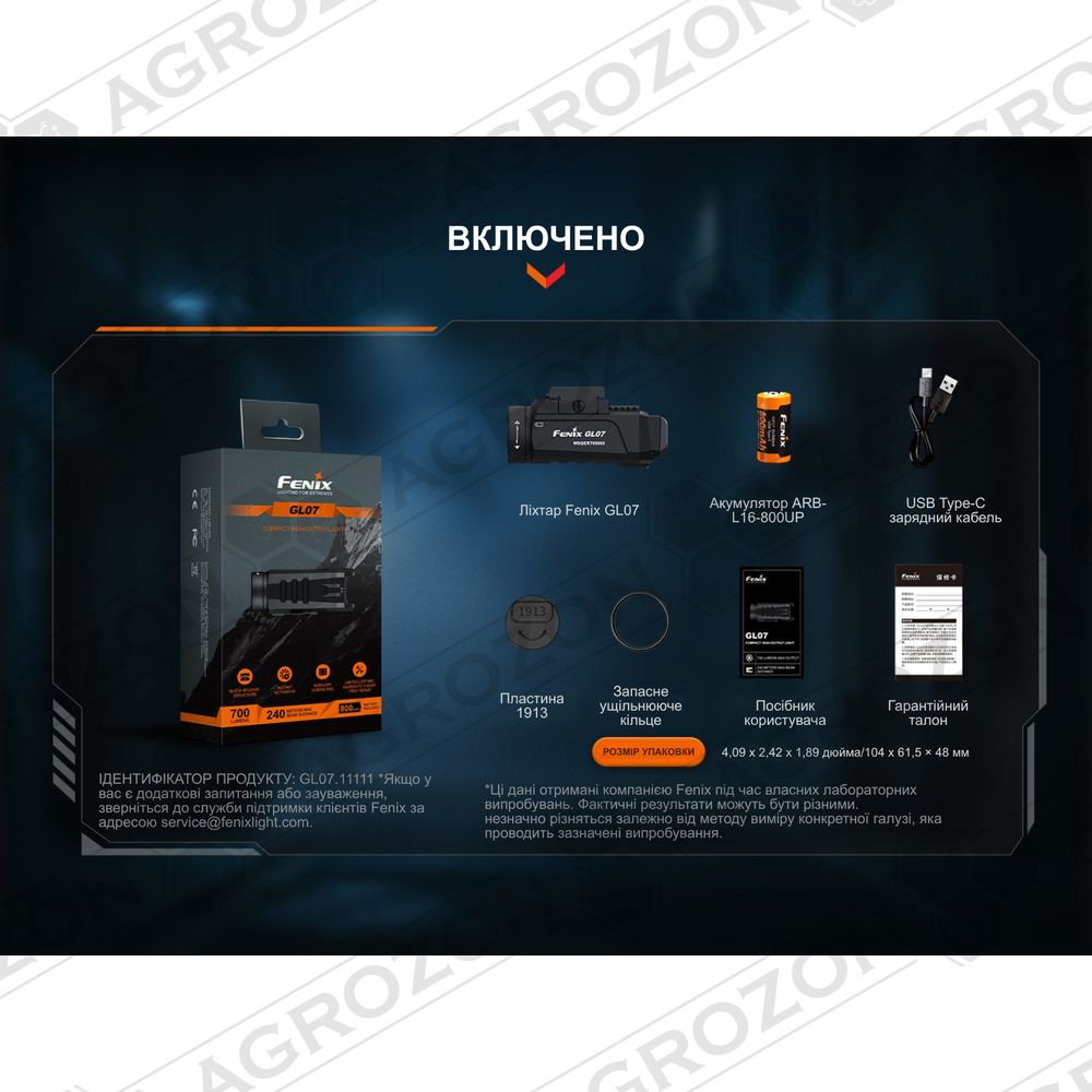 Ліхтар Fenix GL07, акумулятор ARB-L16-800UP, адаптер для 1913, зарядний кабель USB-C, запасне ущільнювальне кільце, інструкція користувача, гарантійний талон.