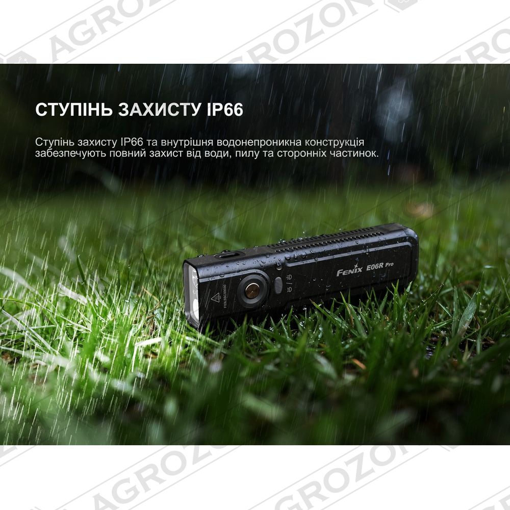 Корпус витримує падіння з висоти до 1 м і має ступінь пило- та вологозахисту IP66, що дозволяє використовувати ліхтар навіть у разі попадання під сильні струмені води.