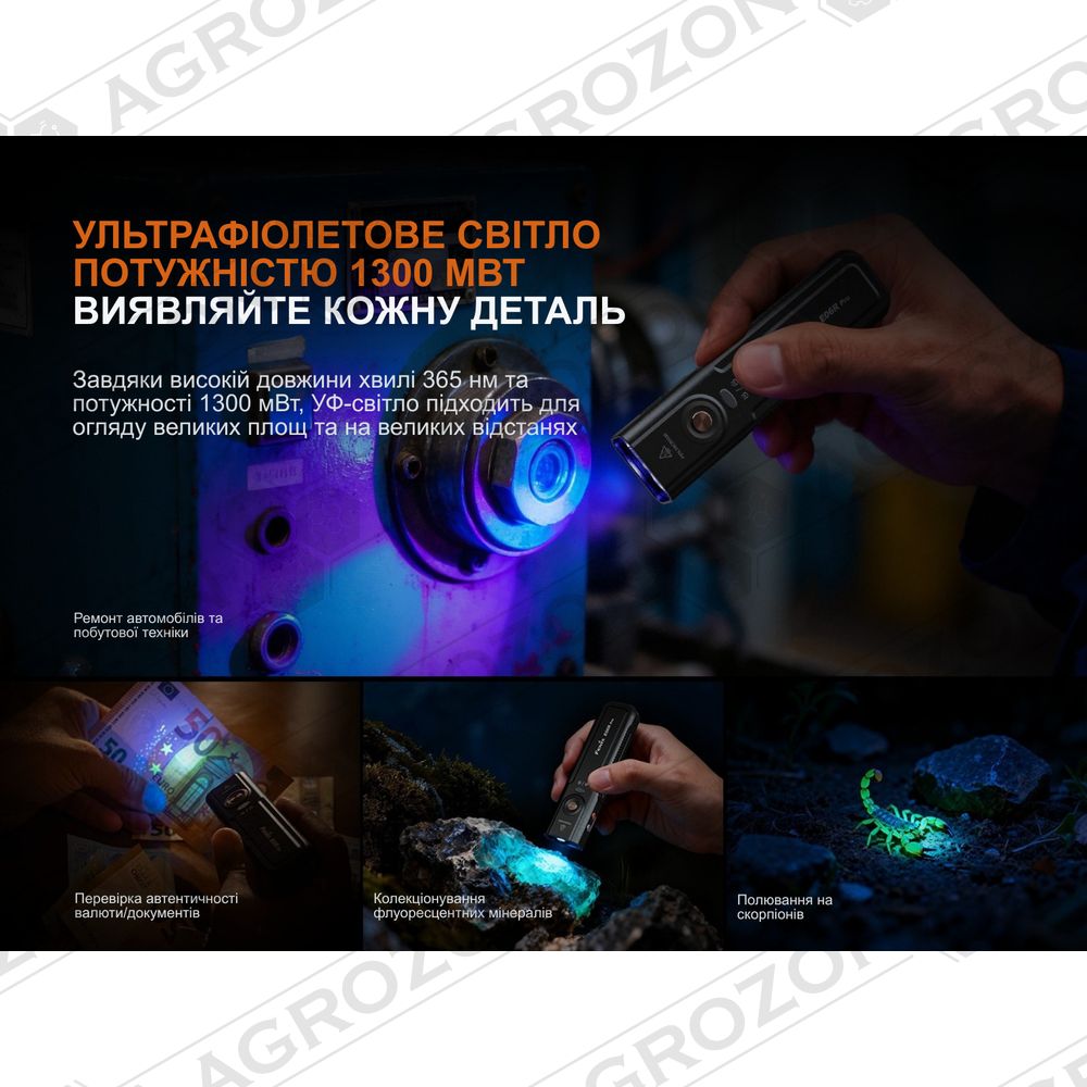 - Ультрафіолетовий світлодіод 365 нМ для перевірки справжності документів та грошових купюр, пошуку витоків хімічних рідин та плям у темряві;