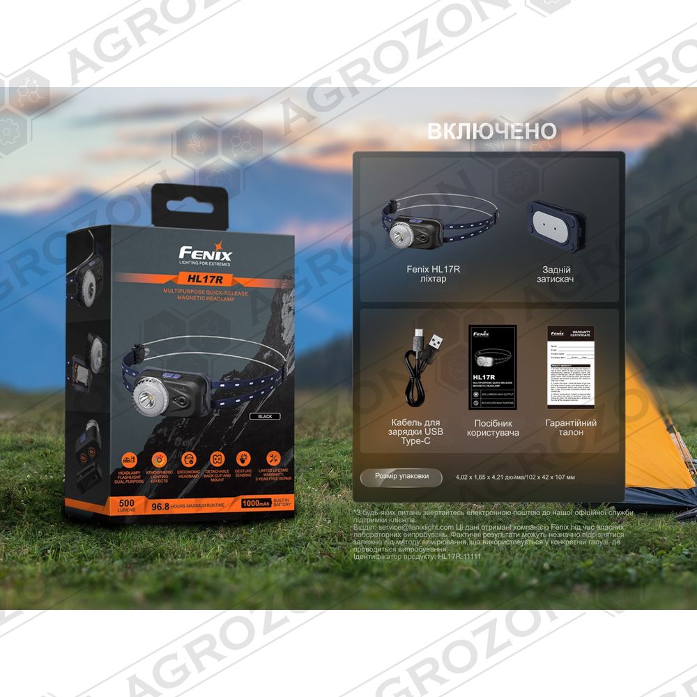 Ліхтар Fenix HL17R, задній затискач, зарядний кабель USB Type-C, гарантійний талон, посібник користувача.