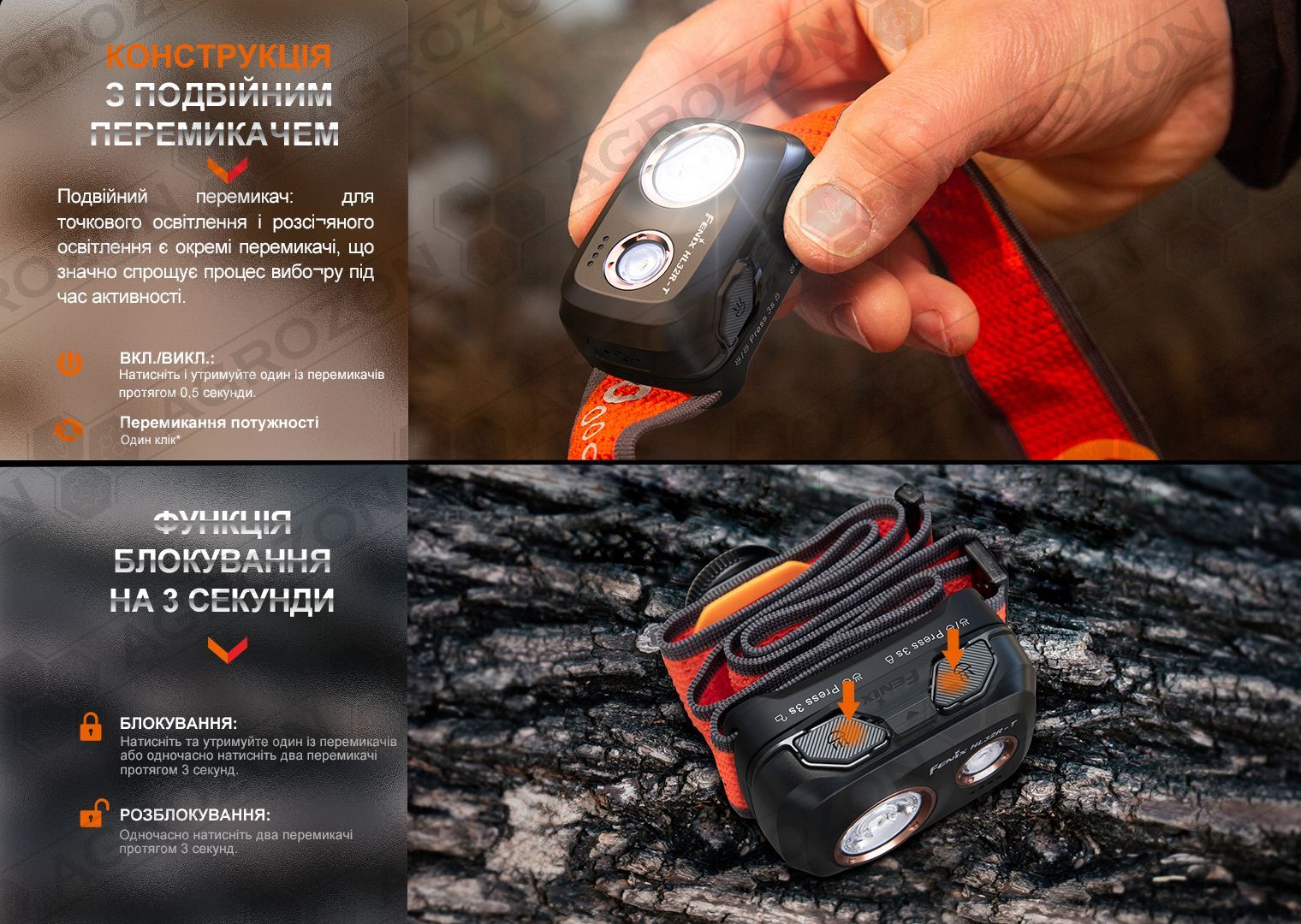 В нових версіях ліхтаря 2024 року випуску для блокування одночасно натисніть два перемикача та утримуйте їх впродовж 3 секунд.
