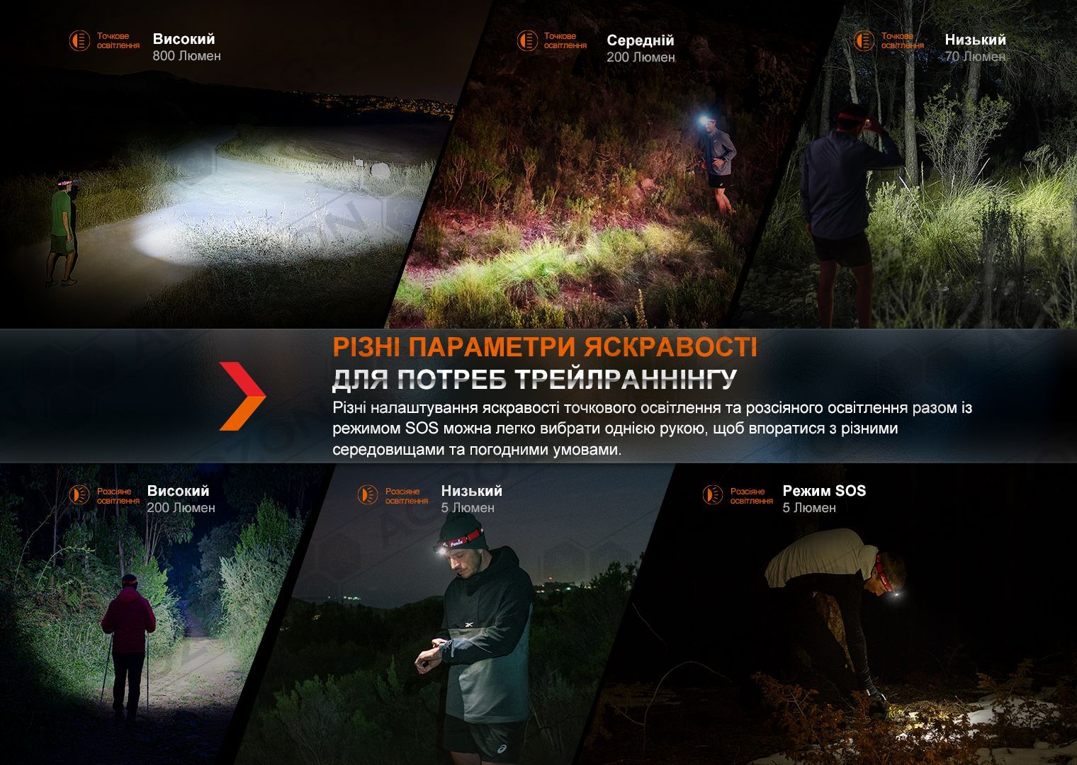 До далекобійної групи входить три режими яскравістю від 70 до 800 люменів, а до групи з ближнім світлом — чотири варіанти світла, включаючи миготливий SOS.