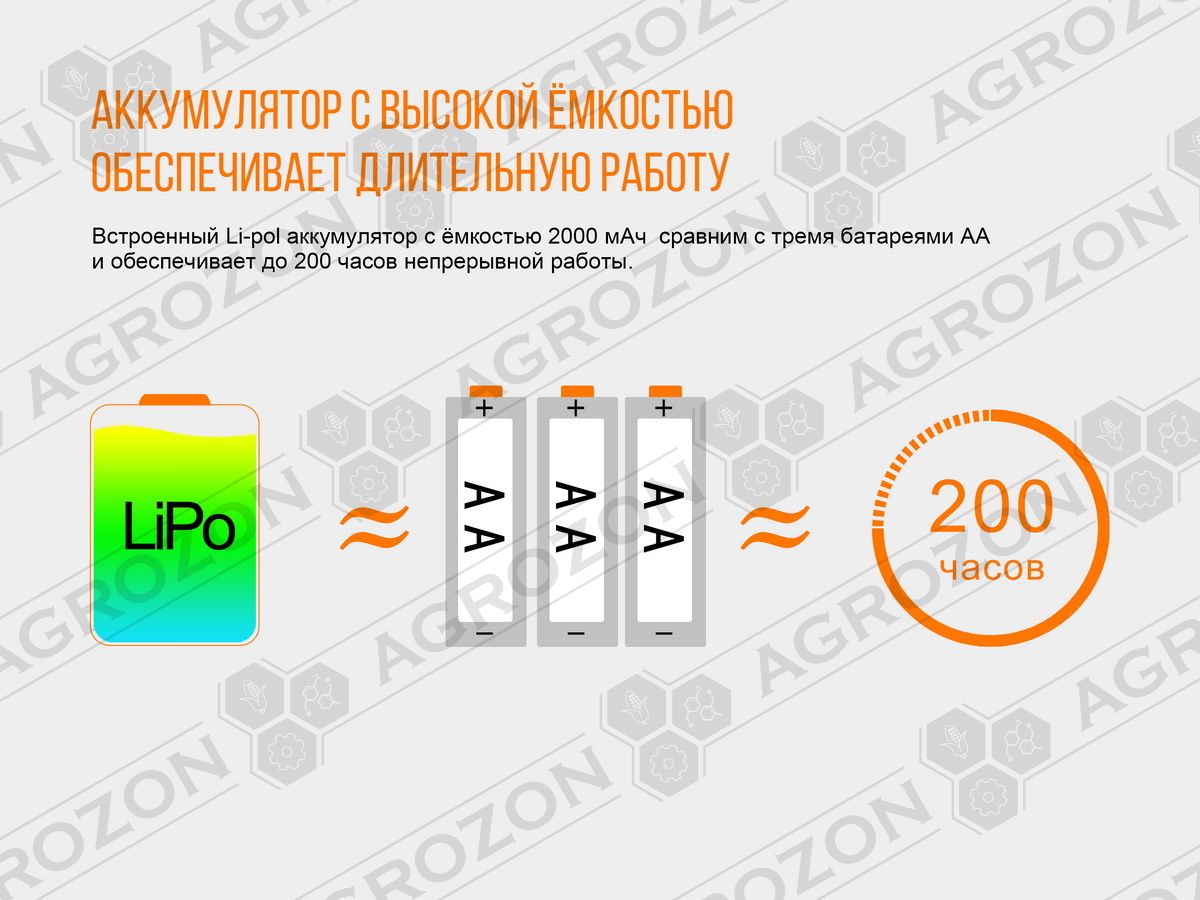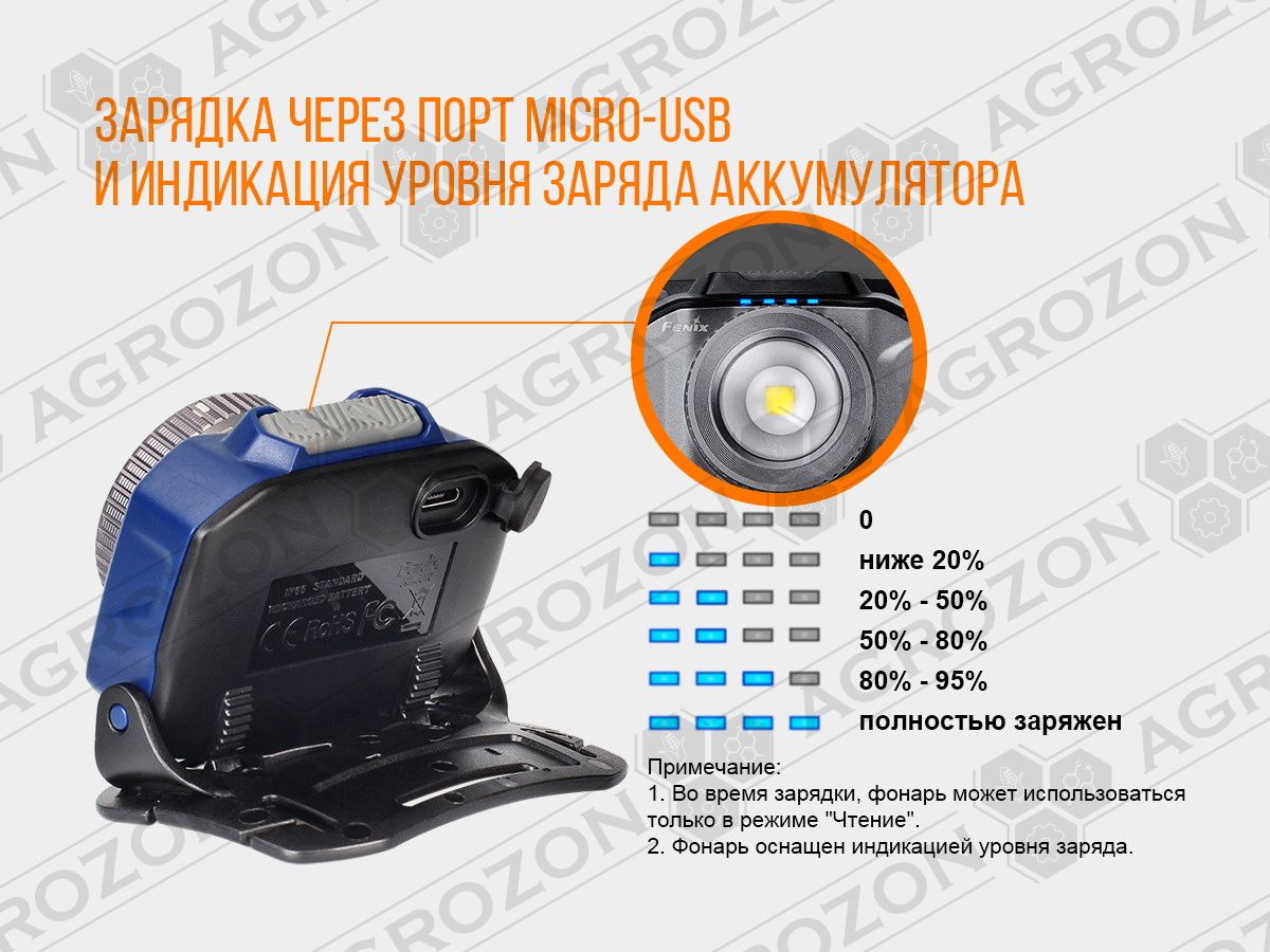 Дана модель налобного ліхтаря працює з якісним вбудованим акумулятором літій-полімерного типу. Він має ємність 2000 ма, що можна порівняти з запасом енергії трьох звичайних батарейок АА. Зарядити акумулятор можна від будь-якого зовнішнього пристрою, якщо підключити ліхтар до нього через кабель з роз'ємами USB і micro-USB. Вбудований індикатор буде повідомляти користувачу про статус зарядки. Один миготливий діод відповідає кількості заряду менше 20%. Один постійно світиться діод і один миготливий – про заряді 20-50%. Два світних і один миготливий діод – 50-80% заряду. Три світяться і один миготливий відповідають рівню заряду 80-95%. Чотири світяться діода – це повністю заряджений акумулятор. Дізнатися рівень заряду при роботі ліхтаря теж можна, але в цьому випадку 4 світяться діода говорять про рівень заряду 80-100%, 3 діода – 60-80%, 2 діода – 40-60%, 1 діод – 20-40%, 1 миготливий діод – менше 20%.