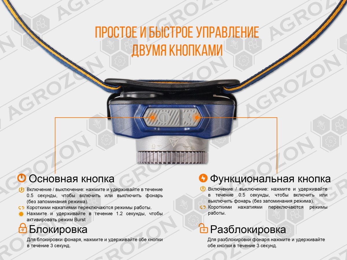 Зручно, що включення ліхтаря HL40R можна заблокувати. Для цього потрібно будь-яку з його кнопок або відразу ж обидві потримати натиснутими протягом 3 секунд. Після цього ліхтар можна без побоювання носити в сумці або кишені.