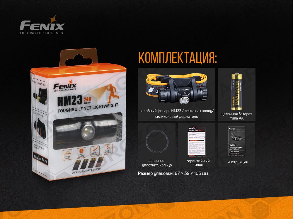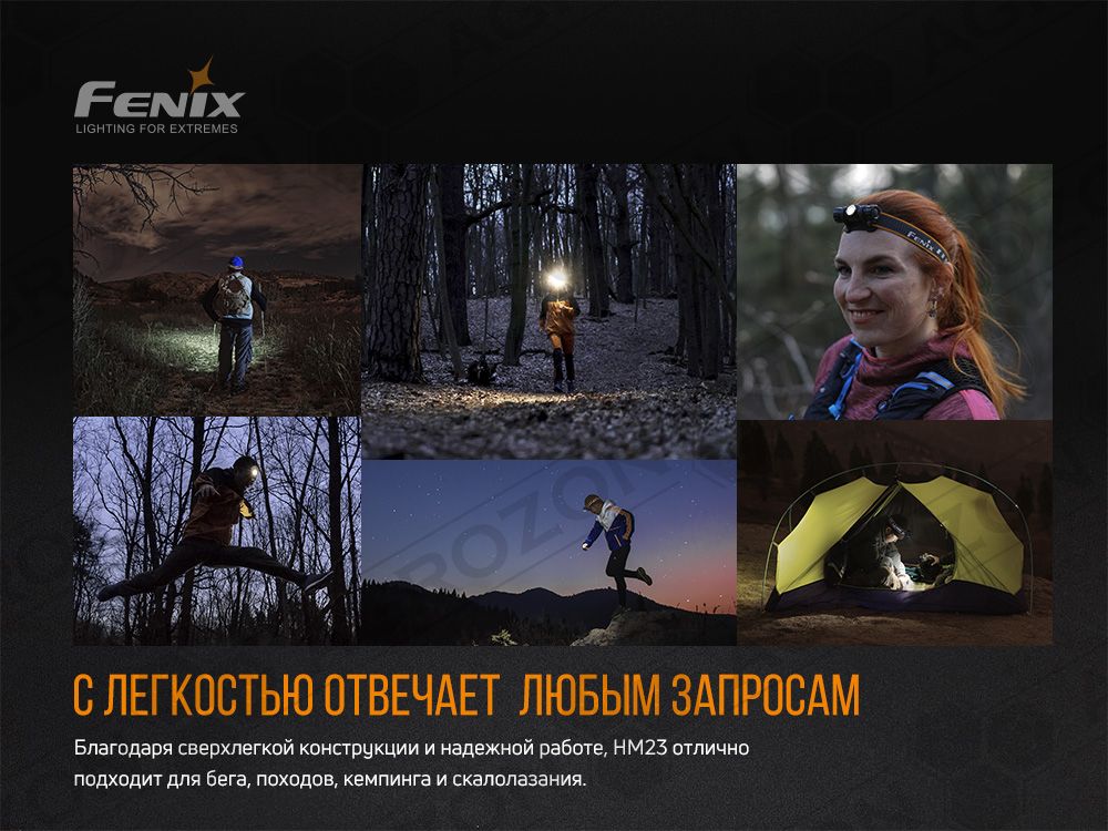 Модель Fenix HM23 відноситься до популярної категорії налобних джерел світла. Вона зручна тим, що дає повну свободу дій, адже обидві руки користувача вільні. Цей ліхтар сподобається рибалкам, туристам і велосипедистам, а також любителям пікніків і вечірніх пробіжок. Він працює з одним довговічним діодом Cree, який дає нейтрально-біле світло. Ліхтар підтримує 3 різних за яскравістю режиму: