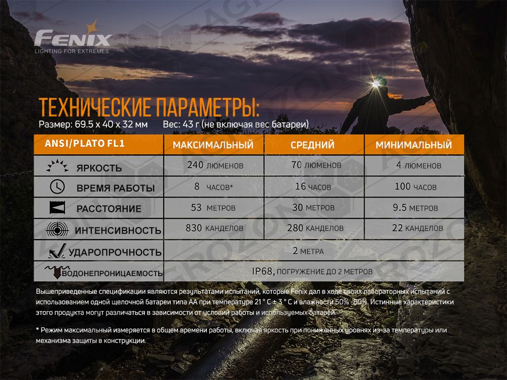 - Low: яскравість ліхтаря становить 4 люмена, а дальність його променя – 9,5 м.інтенсивність променя – 22 кд. З новою батарейкою ліхтар працює 100 год.