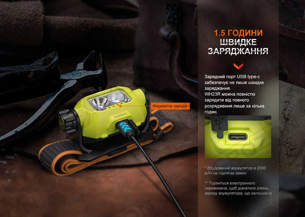 Універсальний налобник WH23R дає максимальну яскравість 600 люменів із найбільшою далекобійністю променя 100 метрів. Комбінований поворотний перемикач можна швидко і точно використовувати навіть у рукавичках або замерзлими пальцями, щоб встановити бажаний режим і яскравість. Додаткові особливості дизайну WH23R включають вбудовану батарею ємністю 2000 мАг, порт зарядки USB Type-C, чотири сині світлодіодні індикатори, що показують заряд батареї, що залишився, і перфоровану структуру оголов'я, що забезпечує кращу повітропроникність і комфорт.