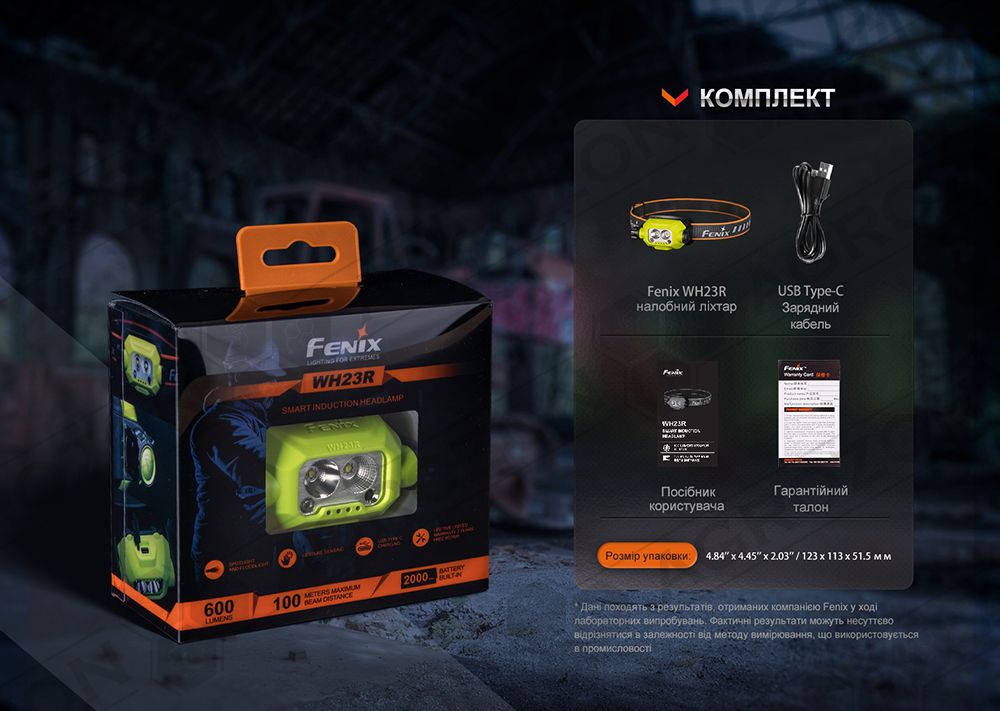Комплектація: модель ліхтаря Fenix WH23R, кабель USB Type-C зарядний, інструкція, талон гарантії.
