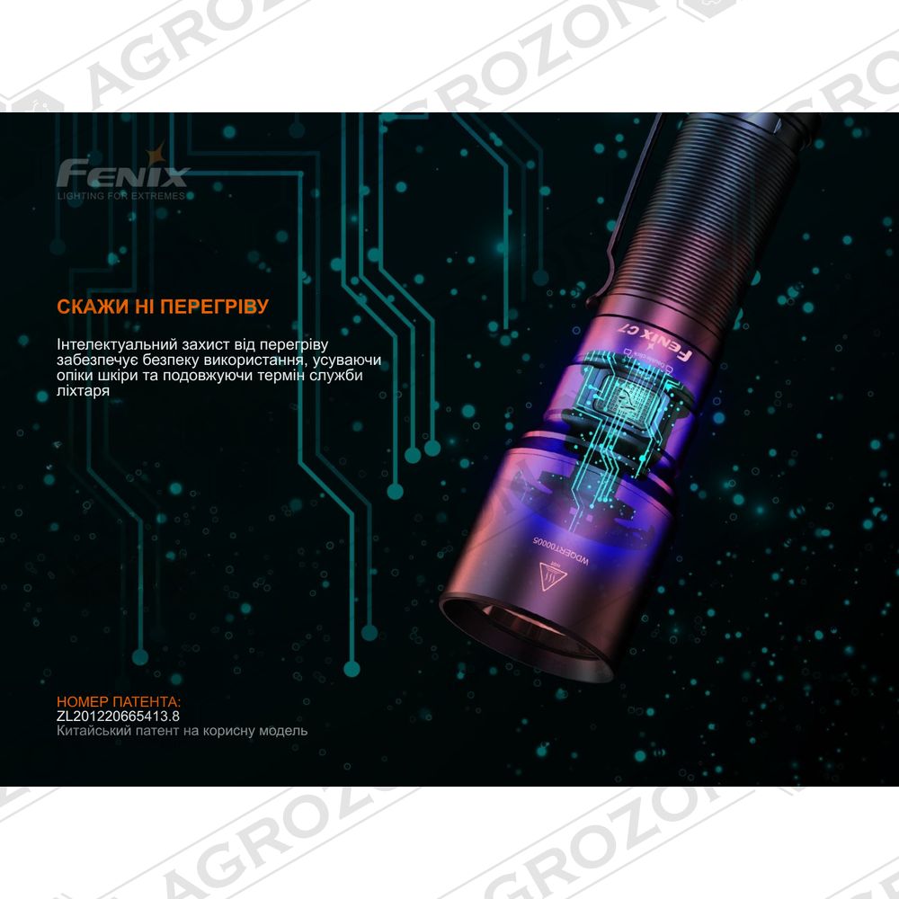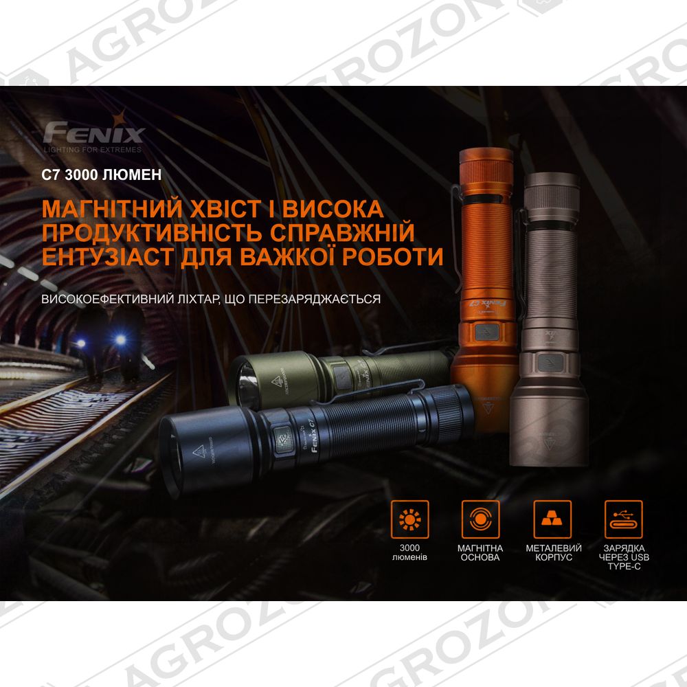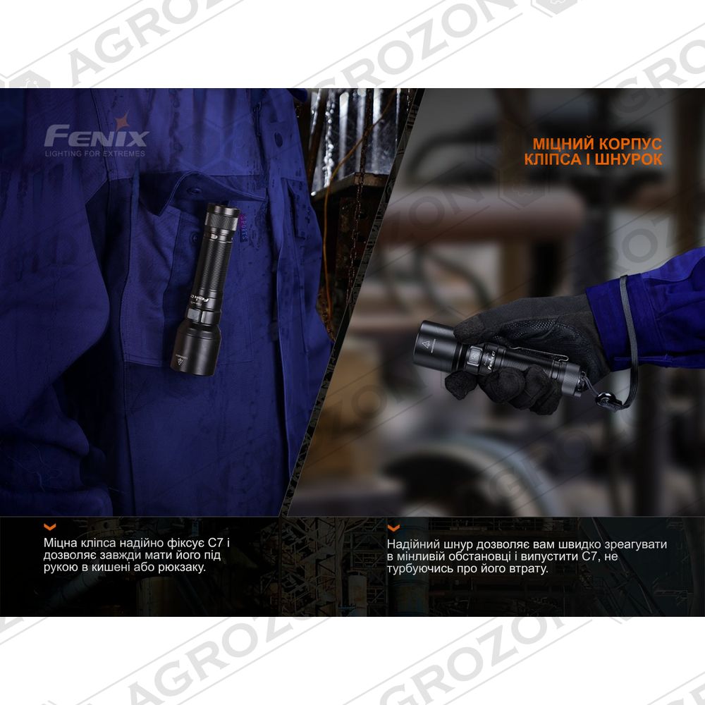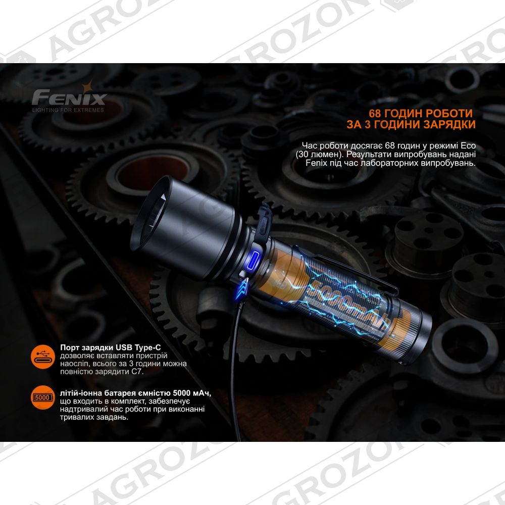 Перезаряджуваний ручний ліхтар Fenix C7 розрахований на побутове застосування та на професійні завдання, де потрібне потужне та автономне джерело світла. В основі — білий світлодіод Luminus SST70 з піковою яскравістю 3000 лм та дальністю променя до 470 м. Ресурс світлодіода сягає 50 000 годин.