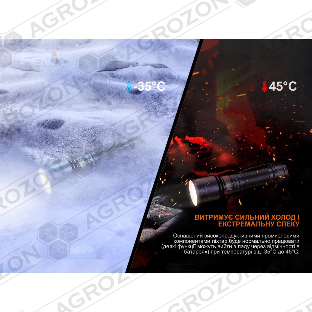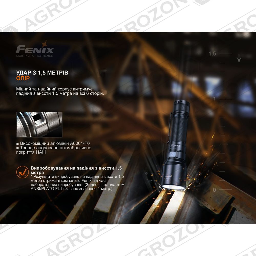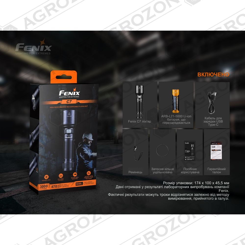 Ліхтар Fenix C7, акумулятор ARB-L21-5000 (21700), зарядний кабель USB Type-C, темляк, запасне ущільнювальне кільце, посібник користувача та гарантія.