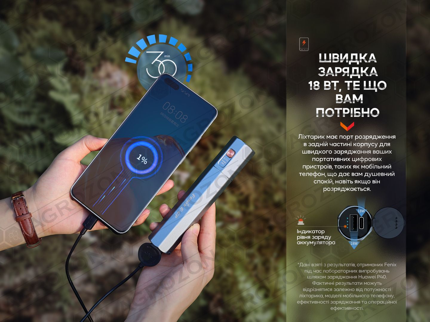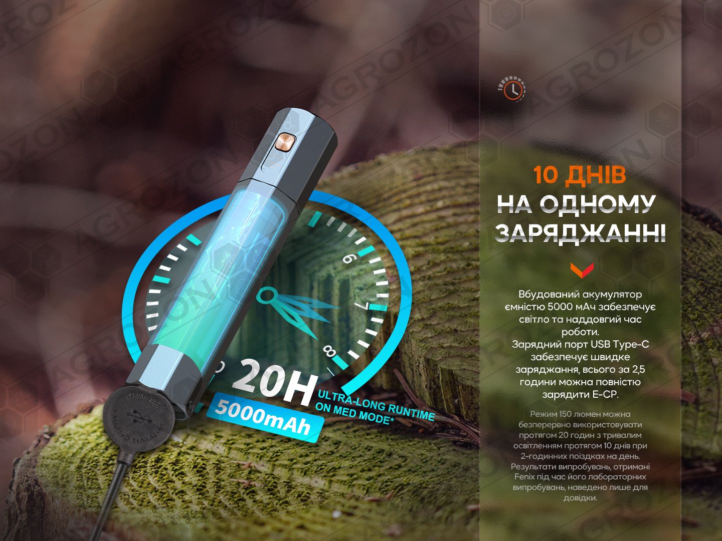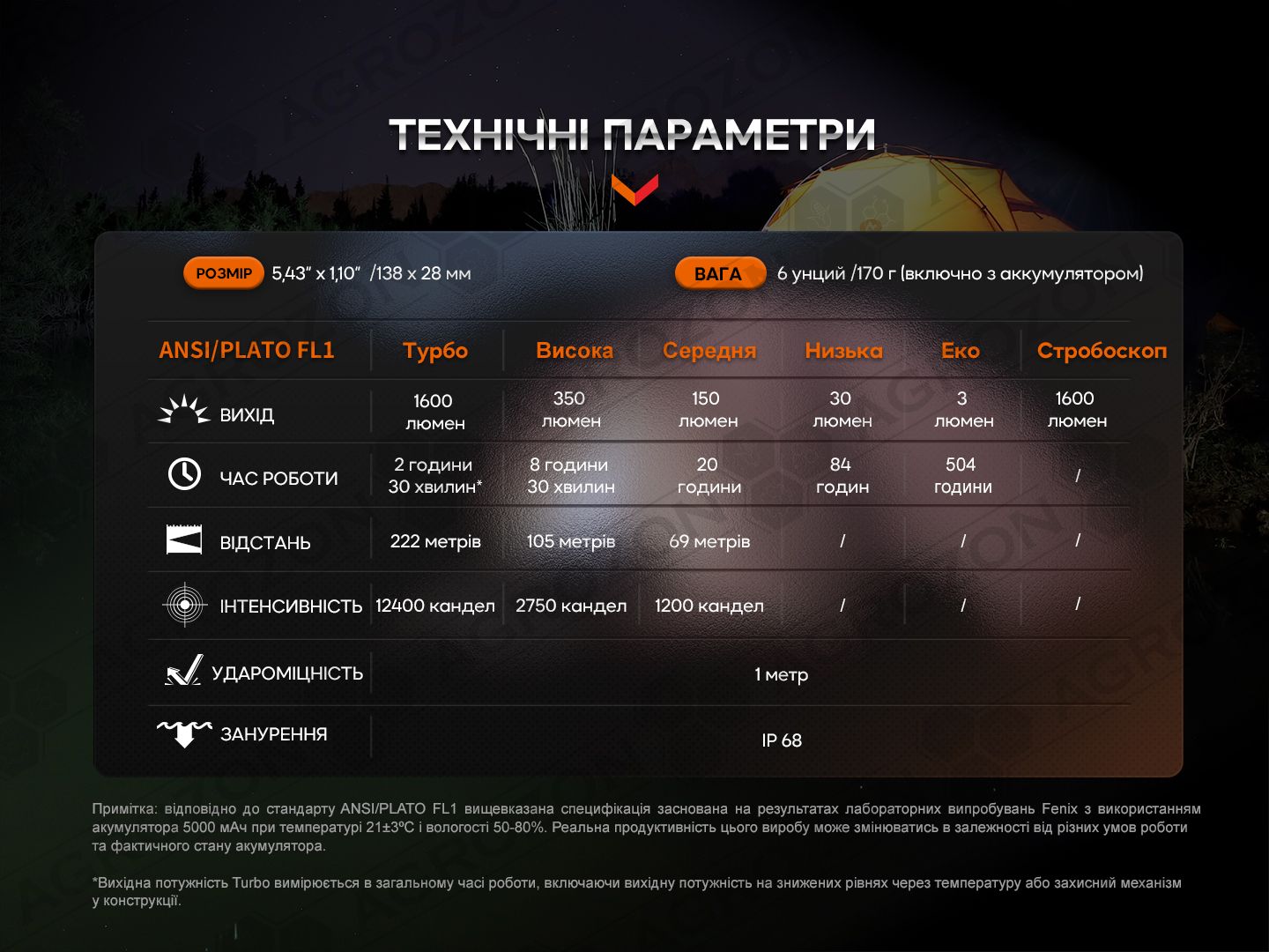 Примітка: показники світіння моделі ґрунтуються на результатах, отриманих фірмою Fenix під час лабораторних дослідів із застосуванням літій-іонного акумулятора ємністю 5000mAh при температурі 21±3°C та вологості 50% - 80%. Реальні параметри роботи ліхтаря можуть відрізнятися залежно від різних умов зовнішнього середовища та акумулятора, що застосовується.