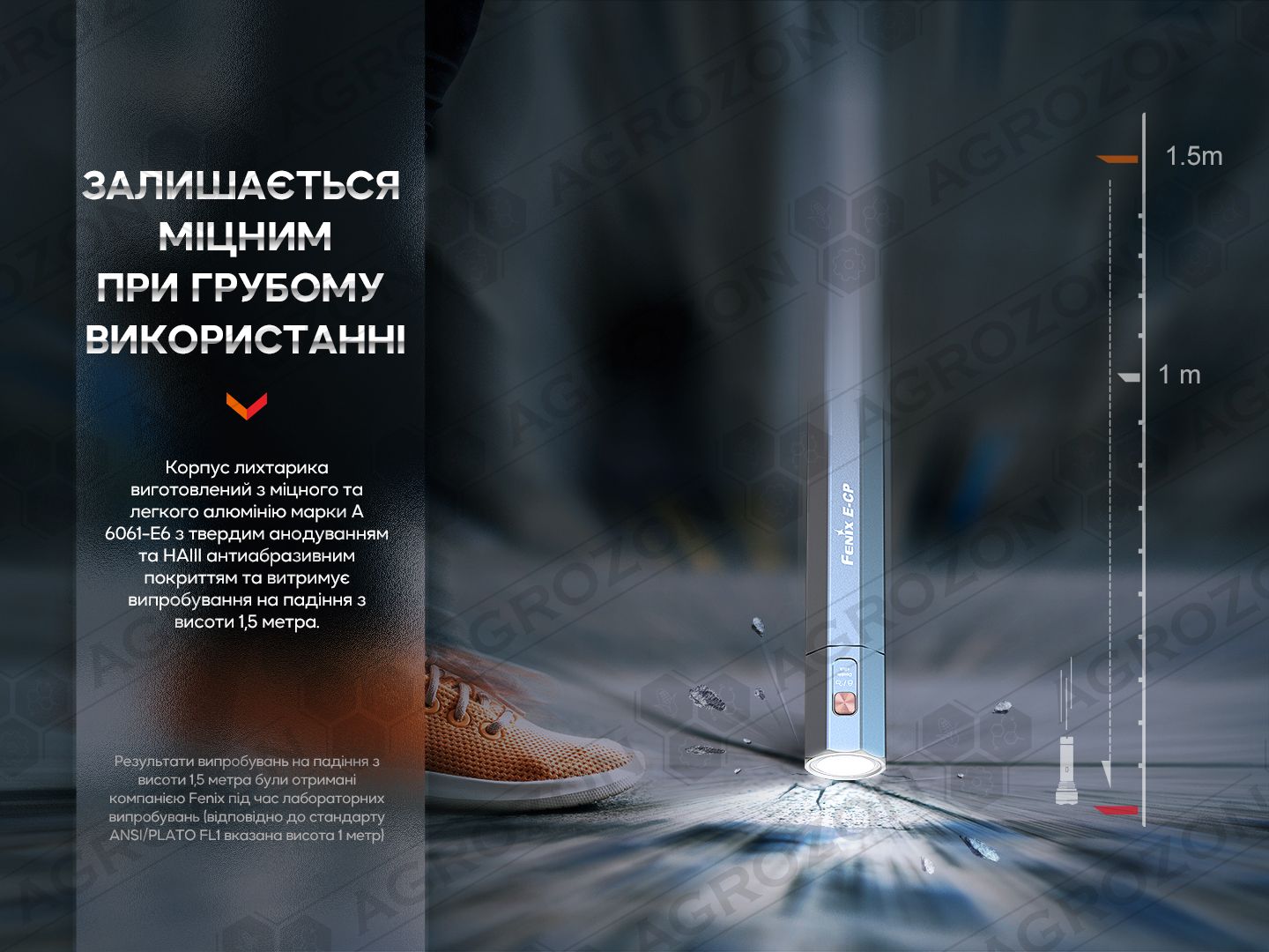 - дієвий захист від зовнішніх факторів – легко переносить падіння з 1,5 метрів та занурення на глибину до 2-х метрів. Перевірено у процесі дослідів у лабораторії Fenix.
