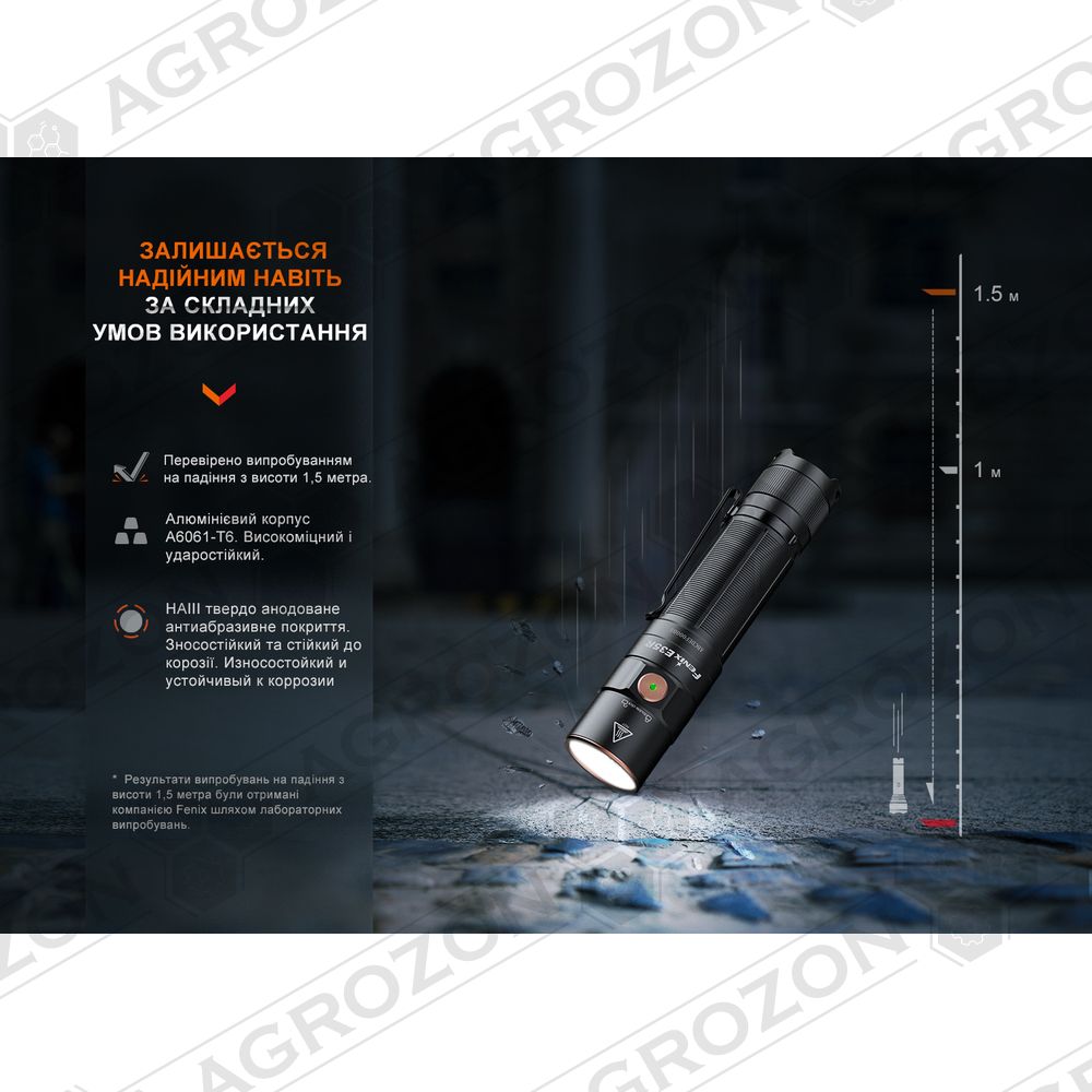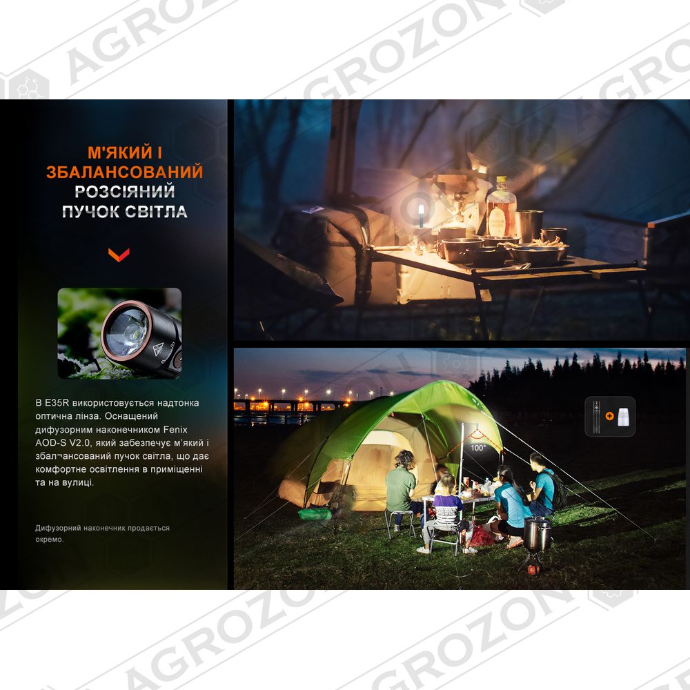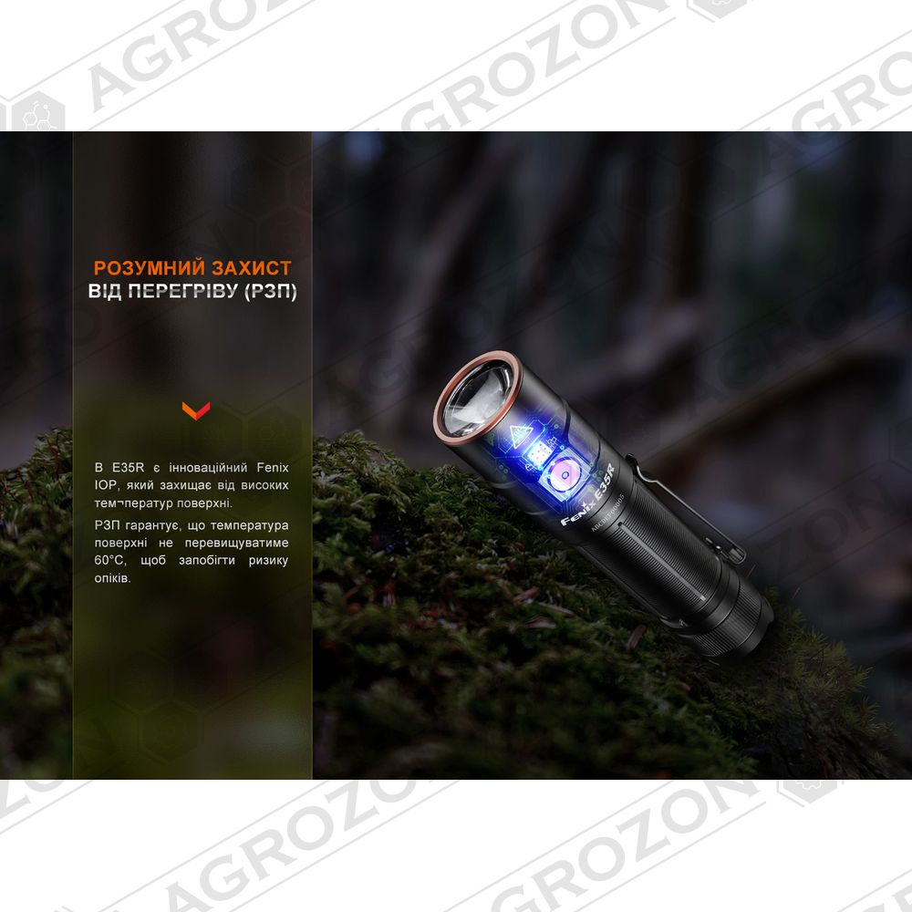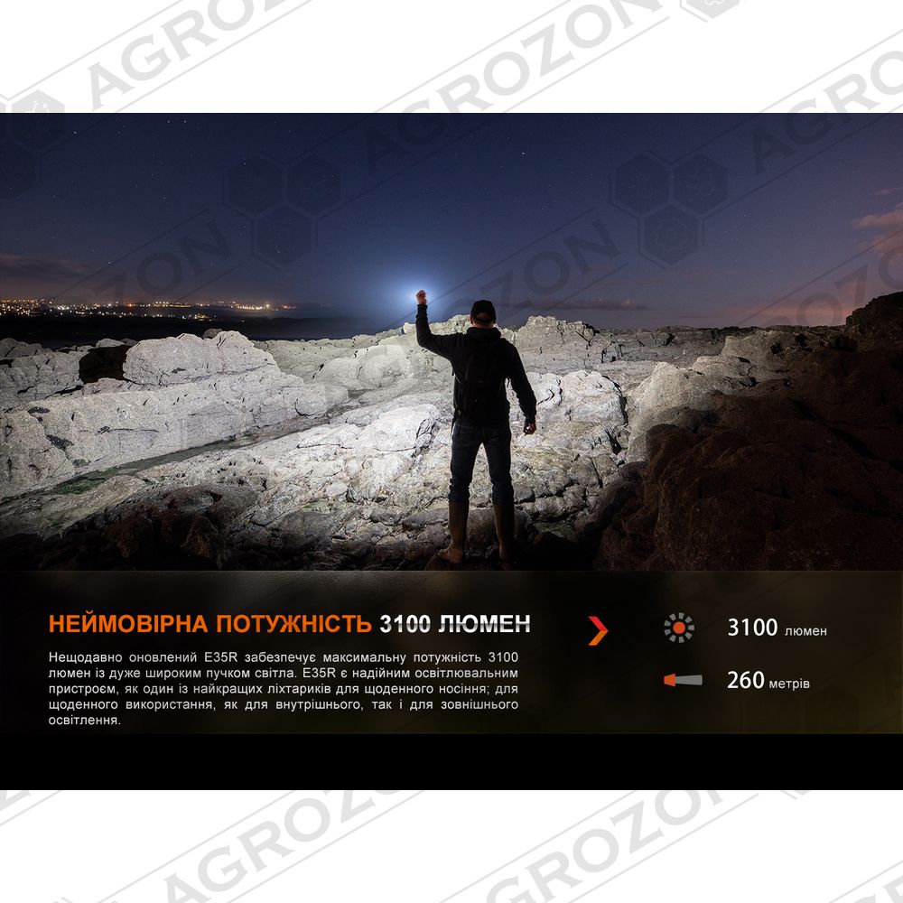 EDC-ліхтар Fenix E35R закриває всі завдання з освітлення у побуті та на просто неба: на риболовлі, у поїздках і професійних цілях. У порівнянні з попередньою версією E35 V3.0, ця модель отримала помітний приріст потужності променя: максимальний світловий потік тепер сягає 3100 люменів, а далекобійність — 260 м.