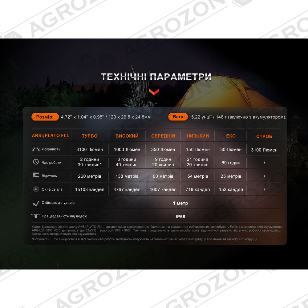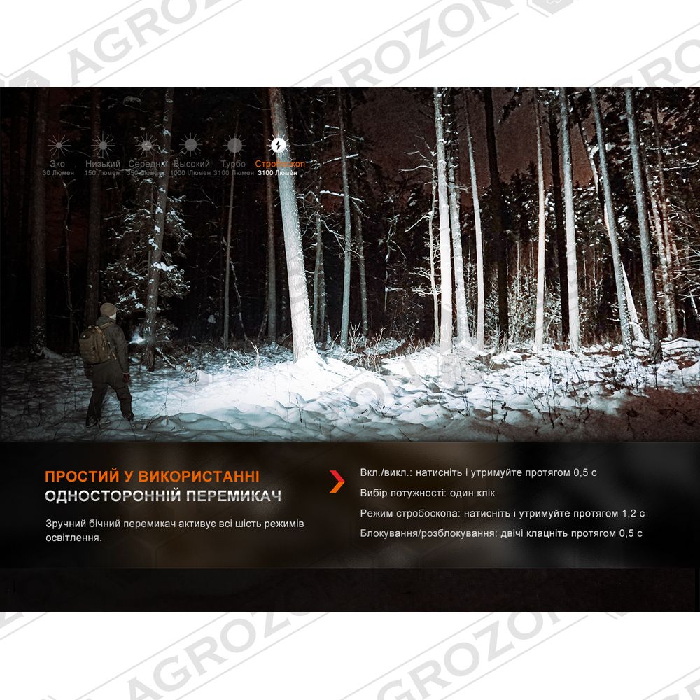- Turbo: 3100 лм – 15103 кд – 260 м – 2 год 30 хв;