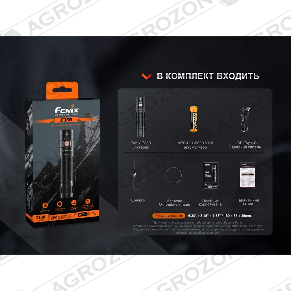 Ліхтар Fenix E35R зі знімною кліпсою, акумулятор Fenix 5000 мА·год, темляк на руку, кабель USB-C для заряджання, гарантійний талон, посібник з експлуатації.