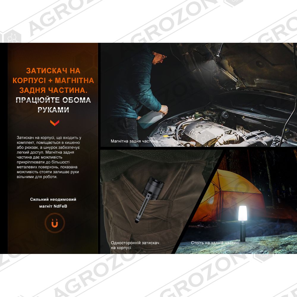 - ручний EDC-ліхтар Fenix зі знімною кліпсою та вбудованим магнітом;