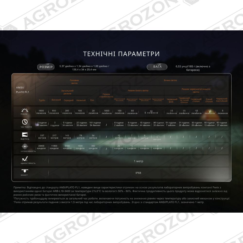 - Турбо: 1800 лм – 28400 кд – 2 год 19 хв – 337 м;