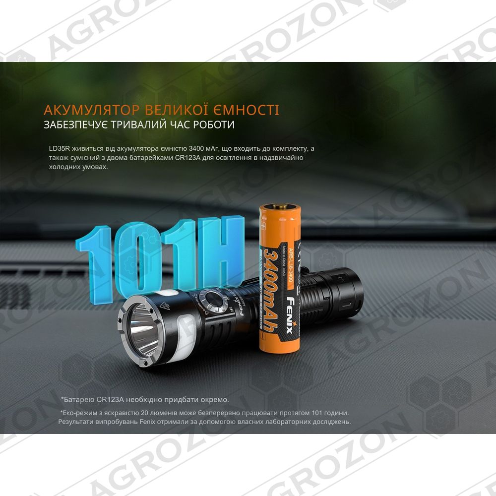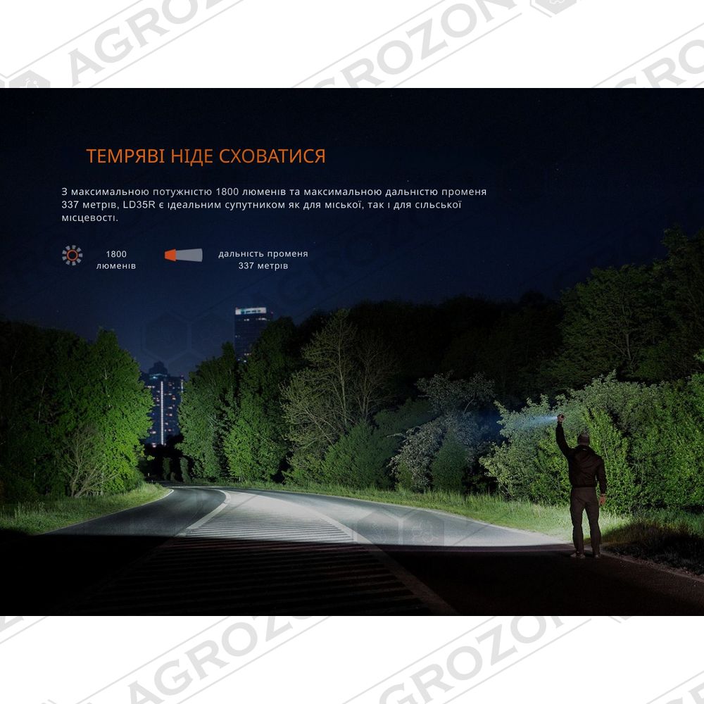 Ліхтар Fenix LD35R, акумулятор ARB-L18-3400, кабель USB-C для заряджання, запасне ущільнювальне кільце, темляк, чохол на пояс, інструкція користувача, гарантійний талон.