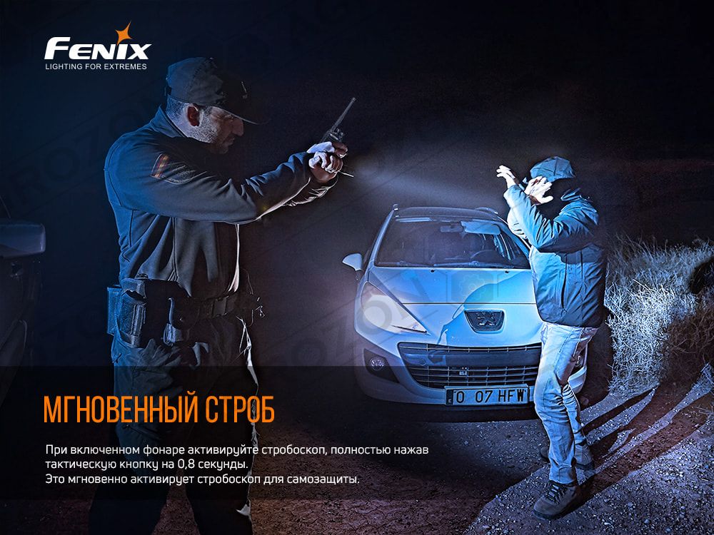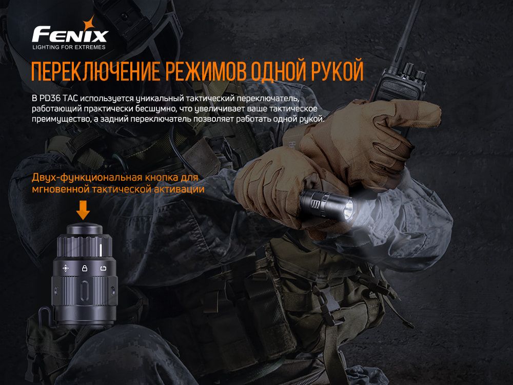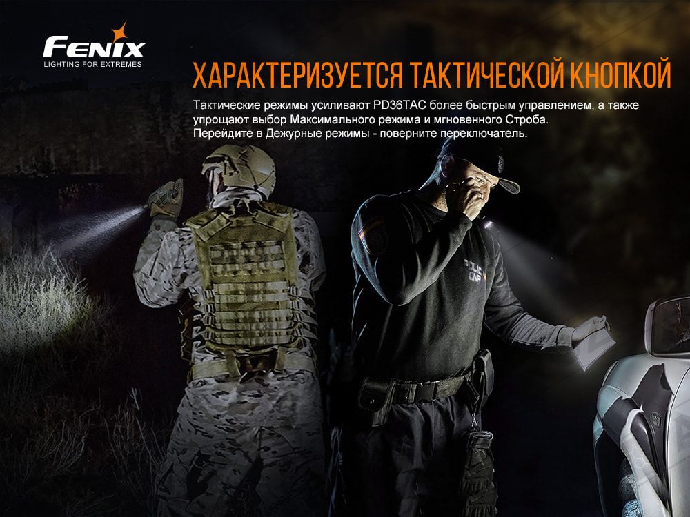 Ліхтар моделі Fenix PD36TAC є тактичним приладом, він стане в нагоді вам в різних видах активного відпочинку і туризму. Ліхтар забезпечує найбільший світловий потік в 3000 люменів, а його далекобійність променя становить 274 метри. Застосований світлодіод-Luminus SST70. Термін служби такого світлодіода досягає 50 тисяч годин. У комплекті разом з моделлю додається літій-іонний акумулятор 21700. Управління відбувається за допомогою запатентованої двофункціональної кнопки, яка здійснює миттєву тактичну активацію.
