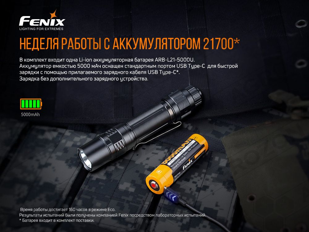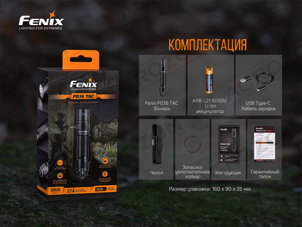Ліхтар моделі Fenix PD36TAC, акумулятор літій-іонний ARB-L21-5000u, кабель для зарядки USB Type-C, чохол, запасне кільце ущільнювача, інструкція до застосування, талон гарантії.