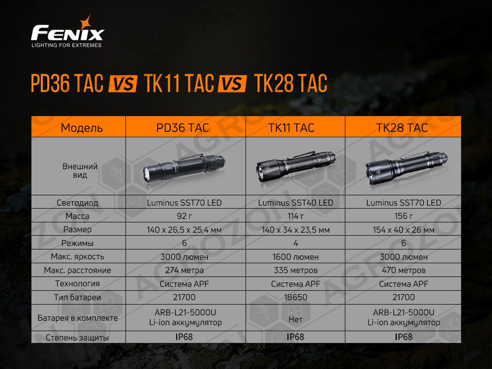 | Fenix PD36 TAC (LUMINUS SST70, ANSI 3000 лм, 21700) | |||||||||||