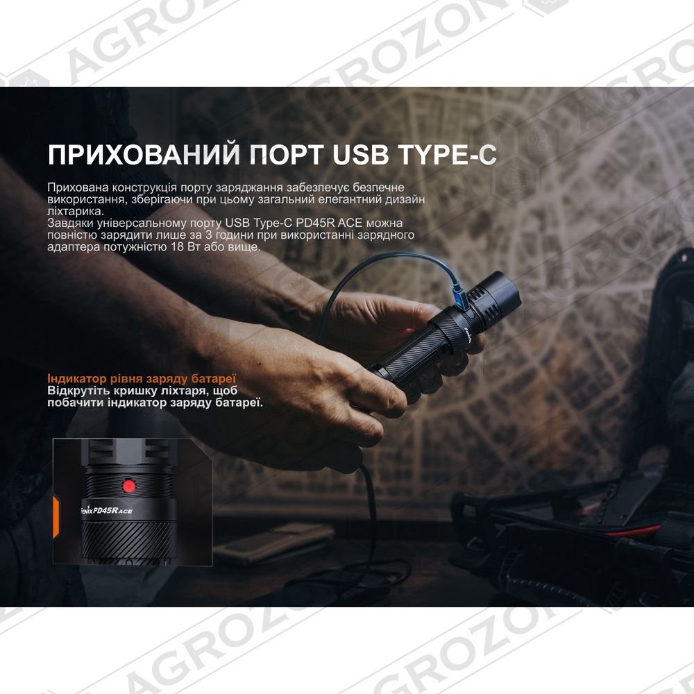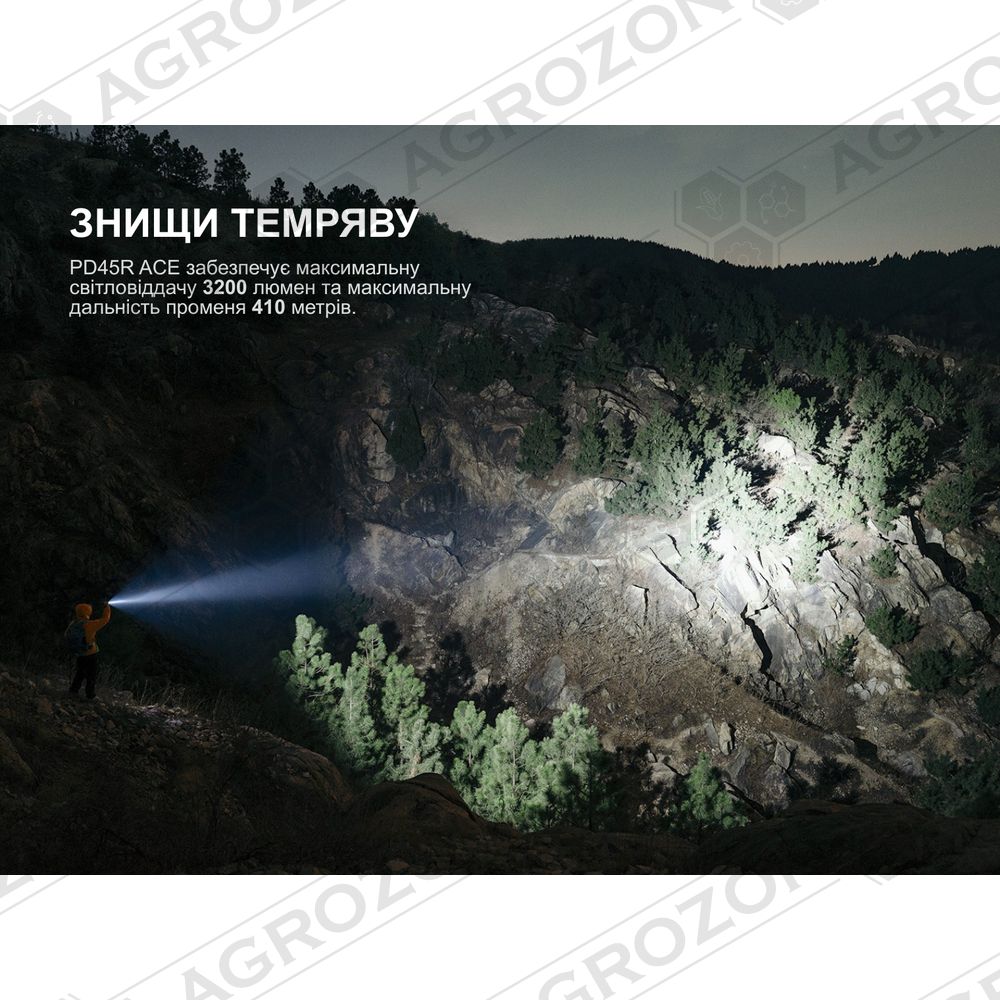 Ліхтар Fenix PD45R ACE, акумулятор ARB-L21-6000, чохол, темляк, 2 х запасні ущільнювальні кільця, зарядний кабель USB-C, інструкція користувача, гарантійний талон.