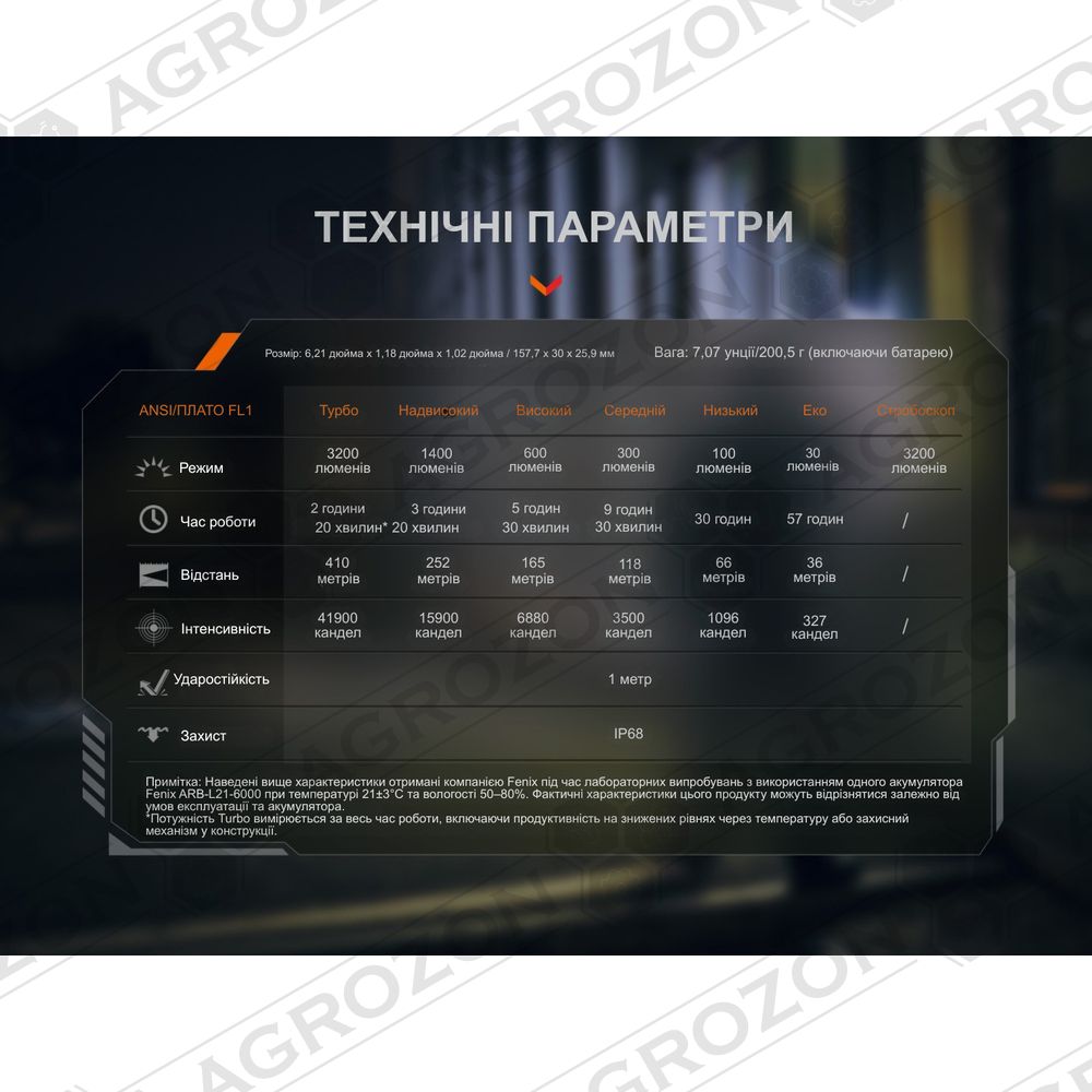 Зверніть увагу! У ліхтарі передбачено захист від перегрівання, який автоматично знижує яскравість променя, якщо внутрішня електроніка нагрівається до 60°C. Час роботи в режимі Turbo вказано з урахуванням спрацювання системи захисту.