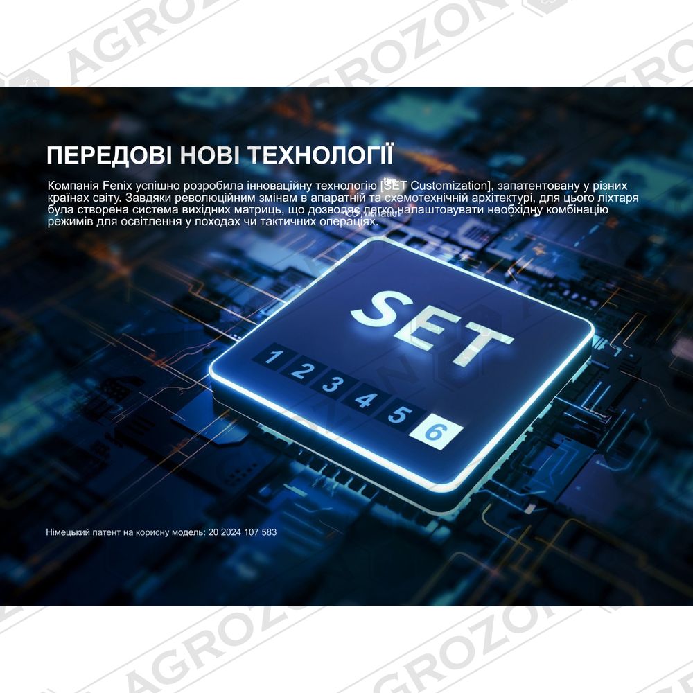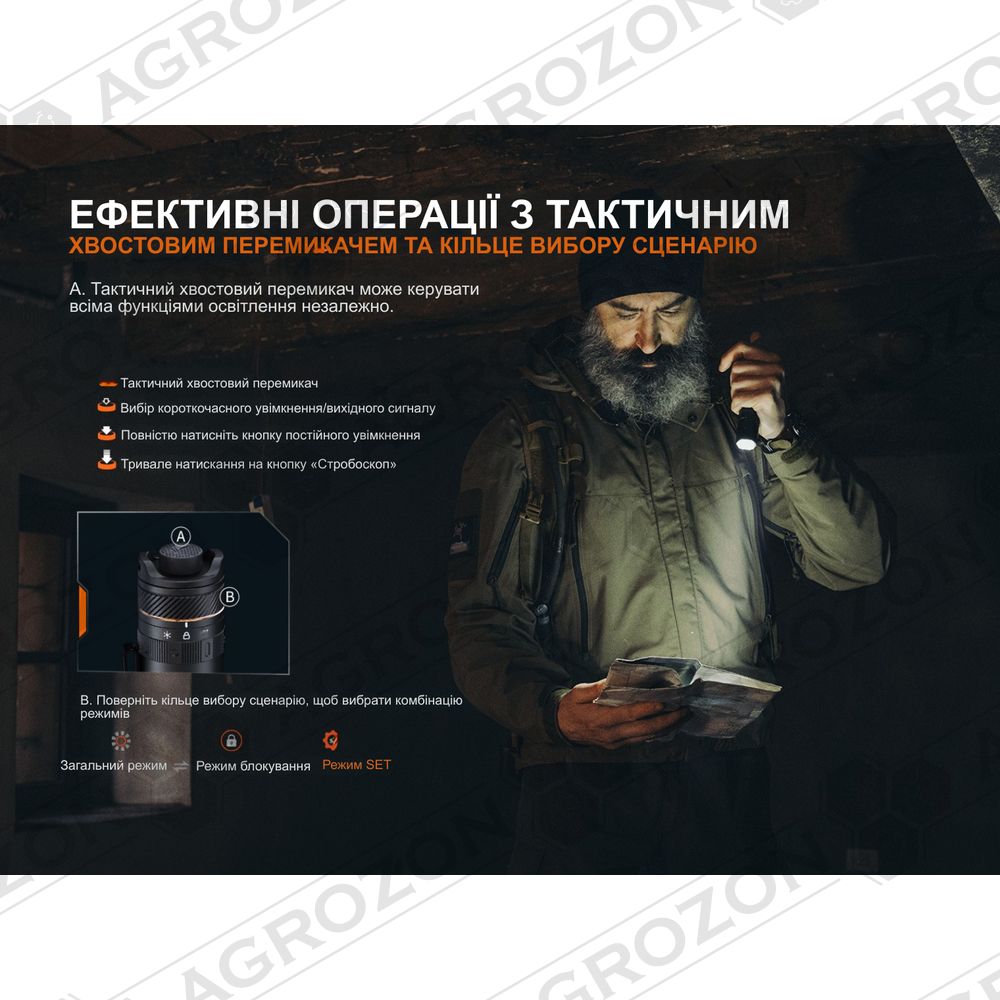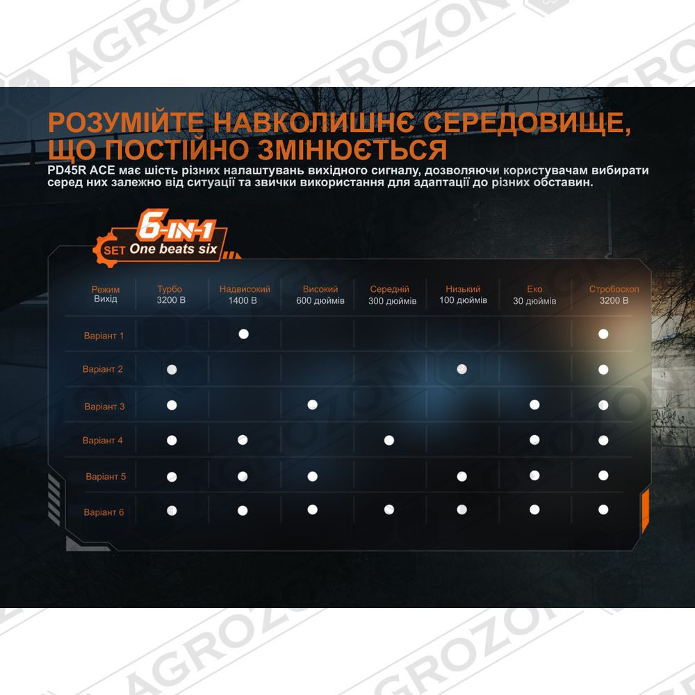 Головна особливість Fenix PD45R ACE — обертове кільце SET. Ви самі вибираєте один з шести встановлених наборів режимів, який підходить під ваші цілі. Також є функція блокування променя (Lock), яка не лише запобігає випадковому ввімкненню пристрою, а й фіксує вже активоване світло.