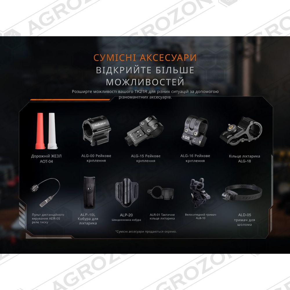 Можливості Fenix TK21R можна розширити за допомогою додаткових аксесуарів (купуються окремо): виносної кнопки AER-05, тактичного кільця ALR-01, кріплення на шолом ALD-05, велосипедного кріплення ALB-10, сигнального жезла AOT-04 та чохлів ALP-10, ALP-10.