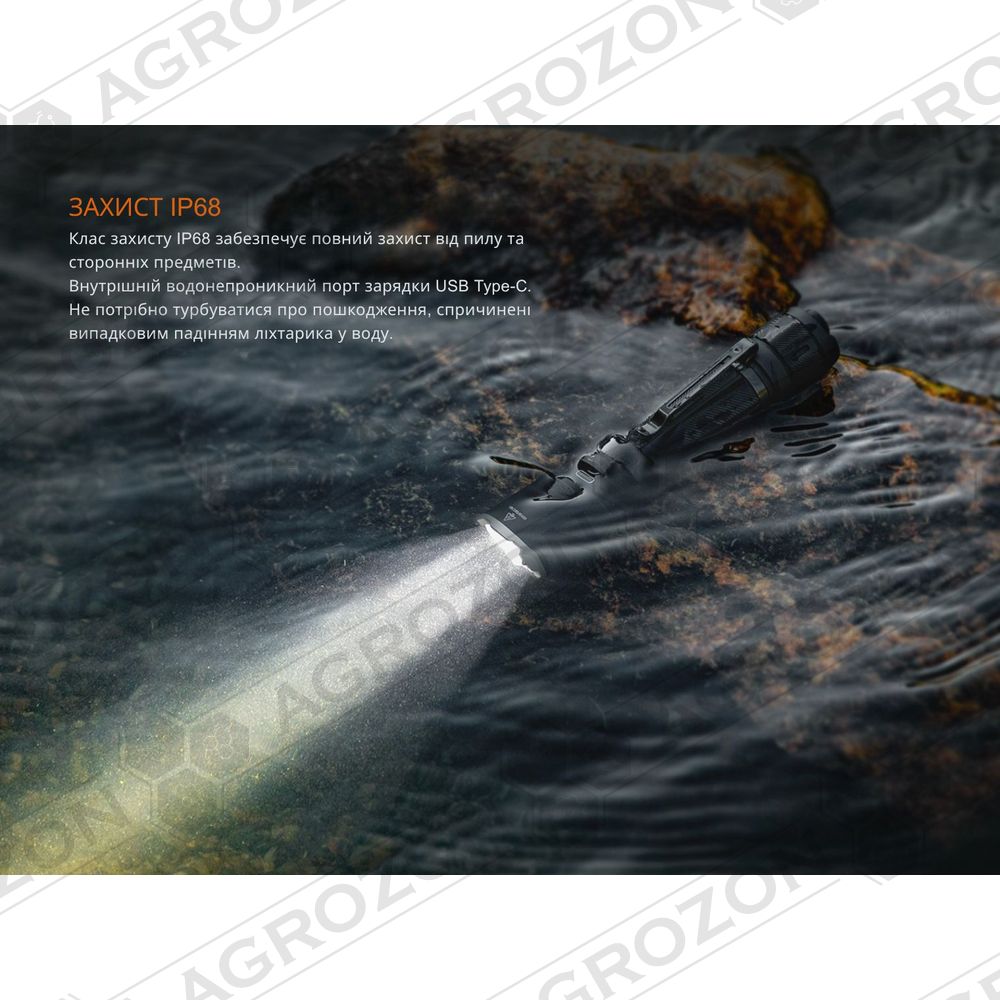 Конструкція має дрібну накатку для міцного утримання та доповнена знімною кліпсою. Стики ущільнені для максимальної герметичності IP68 — ліхтар продовжує працювати навіть після багаторазового занурення у воду.
