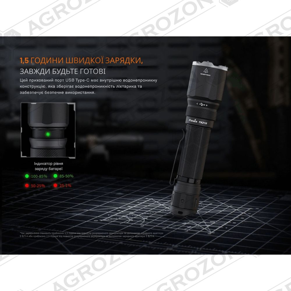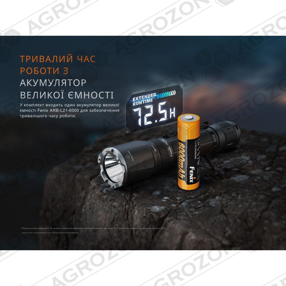 Ліхтар Fenix TK21R, акумулятор ARB-L21-6000, зарядний кабель USB-C, темляк, чохол, 2 ущільнювальних кільця, інструкція користувача, гарантійний талон.