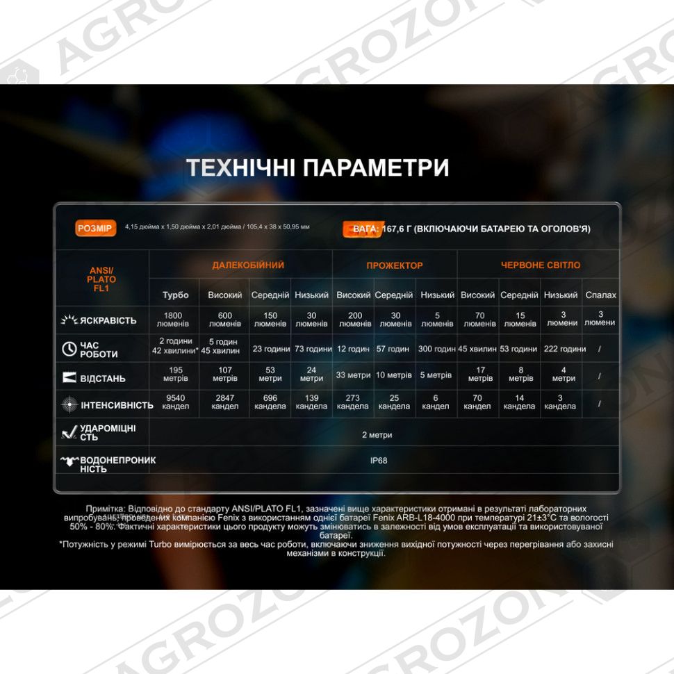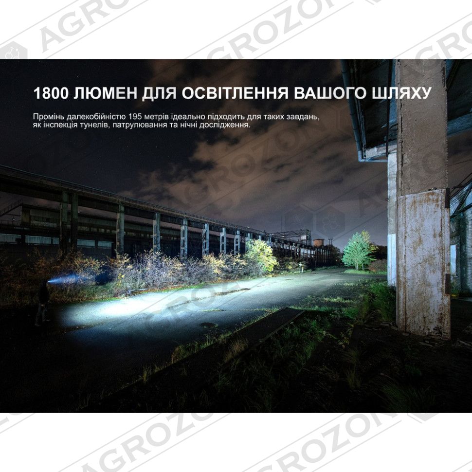 - Турбо: 1800 лм – 9540 кд – 2 год 42 хв – 195 м;