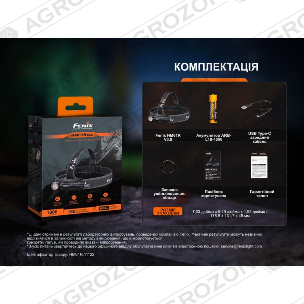 Ліхтар Fenix HM61R V3.0, акумулятор ARB-L18-4000, наголовне кріплення (холдер та ремінець), зарядний кабель USB Type-C, запасне ущільнювальне кільце, інструкція користувача, гарантійний талон.