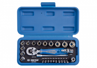 Набір 12-гранних торцевих головок із приладдям King Tony 1/4", 4-14 мм, 27 предметів 2027MRE застосовується при ремонті та обслуговуванні легкових автомобілів, мото- та іншої техніки, різного обладнання та невеликих конструкцій як професіоналами, так і приватними майстрами. Торцеві головки з 12-гранним робочим профілем і приєднувальним квадратом 1/4" виготовлені з високоякісної хромованадієвої сталі з хромуванням і поліруванням поверхні. Вставки (біти) виконані з кремнієвого хромованадієвого сплаву (S2) з подальшою піскоструминною обробкою та покриттям антикорозійним маслом, що забезпечує їм тривалий термін служби. Багатофункціональна тріскачка дозволяє працювати як з торцевими головками 1/4", так і зі вставками. Вона має механізм високої якості з 72 зубцями, прапорцевий перемикач, зручну двокомпонентну рукоятку. Всі інструменти набору відповідають сучасним міжнародним стандартам якості. Поставляються з підкладкою з легкої та міцної матеріалу EVA та в компактному кейсі із пластику PP, стійкого до технічних рідин та температурних перепадів. Комплектація: Головки та приладдя 1/4" головки торцеві короткі 12-гранні: 4, 4.5, 5, 5.5, 6, 7, 8, 9, 10, 12, 13, 14 мм; тріскачка прапорцева: 72 зубці, довжина 108 мм; подовжувач – 100 мм; кардан – 36 мм; тримач вставок (біт) 1/4" - 25 мм. Вставки (біти) 1/4" (6.35 мм) хрестові Phillips: PH1, PH2; шестигранні HEX: H3, H4, H5; TORX: T10, T15, T20, T25, T30, T40.