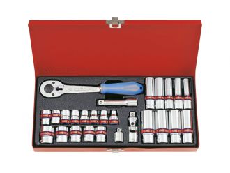 Головки торцеві 3330S 3/8" 12-гранні: 1/4, 5/16, 11/32, 3/8, 7/16, 15/32, 1/2, 9/16, 19/32, 5/8 , 11/16 , 3/4 , 13/16 мм Головки торцеві 3235S 3/8" 6-гранні глибокі: 5/16, 3/8, 7/16, 1/2, 9/16, 5/8, 11/16, 3/4, 13/16 мм Подовжувач 3221: 75 мм Тріскачка 3779-08G 3/8" з прапорцевим перемиканням 200 мм Кардан 3792 3/8" Перехідник 3812 3/8">1/4"
