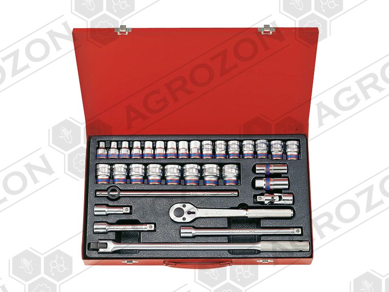 Купити набір головок з комірами Кінг Тоні – вигідна ціна Тайванський виробник King Tony вдало підібрав компонування для набору. Є всі затребувані торцеві насадки за розміром. Комплект включає тріскачку з прапорцевим перемикачем, коміри, подовжувачі і кардан. У наборі присутні 2 головки свічки з гумовими вставками на 16 і 21 мм. Такий комплект стане найкращим рішенням для обслуговування вузлів моторної групи. Виготовлено інструмент із хромованадієвої сталі, оздоблення – хромування. Головки комірів мають захисне покриття – фосфатний потоплений. Оснащення підходить для використання в агресивних умовах цеху або гаража. Інструмент стійкий до пар палива, масел, розчинників. У комплекті йде металевий кейс та пластиковий ложемент. Технічні характеристики набору інструментів (4534MR):