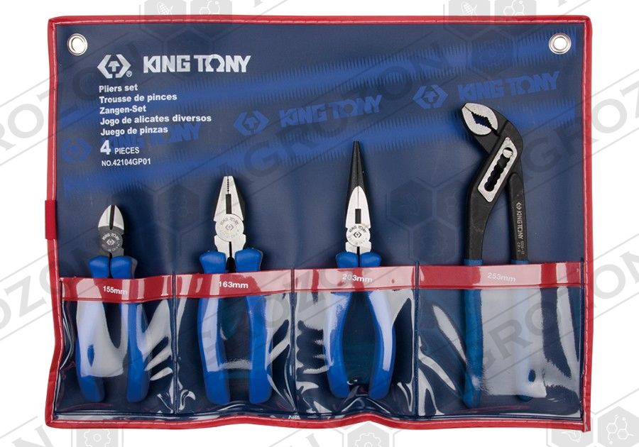 Набір пасатижів, плоскогубців та бокорізів, 4 предмети Набір шарнірно-губцевих інструментів KING TONY , 4 шт. (42104GP01) особливості: Переставні кліщі німецького типу; 7 позицій відкриття; матеріал ручок ПВХ Плоскогубці призначені для захоплення та утримання деталі; європейського типу; матеріал ручок PP+TPR Довгогубці мають подовжені тонкі губки, які дозволяють працювати у важкодоступних місцях; європейського типу; матеріал ручок PP+TPR Бокорізи використовуються для поділу різних металевих прутів, кабелів, гвоздиків, шнурів; європейського типу; матеріал ручок PP+TPR Висока якість матеріалів Тривалий термін служби Комплектація: Переставні кліщі 253 мм Плоскогубці 163 мм Довгогубці 200 мм Бокорізи 163 мм Поставляється у футлярі