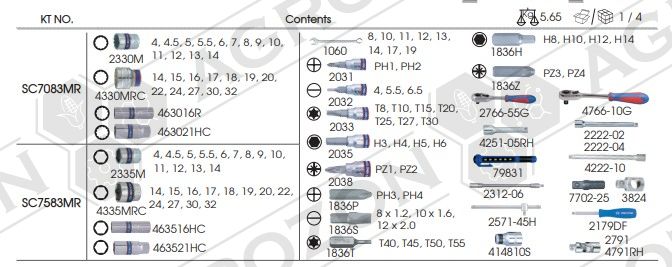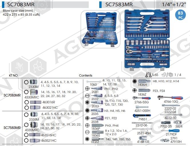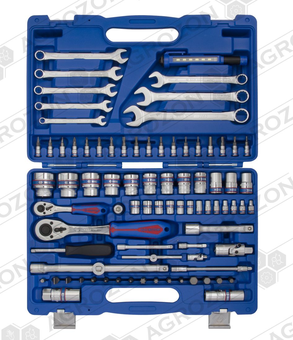 Універсальний набір інструментів 1/4"+1/2" 83ін. KINGTONY SC7583MR Універсальний набір інструментів підібраний таким чином, щоб догодити власникам автотранспортних засобів та майстрам на СТО. Комплект з 83 аксесуарів призначений для розбирання або збирання вузлів та механізмів двигуна, трансмісії, ходової частини та елементів кузова. Інструмент підходить для відновлення українських та імпортних автомобілів. Такі інструменти корисні в гаражі чи багажнику машини. Для автомобіліста набір буде затребуваним подарунком. Набір представлений на ринку у пластиковому кейсі, що забезпечує цілісність інструменту при зберіганні чи транспортуванні. Гідність валізки з ручкою – наявність форм під інструмент усередині. Власник, перед закриттям кейсу, легко визначить, якого аксесуару не вистачає і усуне нестачу на місці. Легована інструментальна сталь, з якої виготовлений інструмент у наборі, гарантує власнику відмовостійкість у роботі. На інструменті є маркування заводу-виробника, що підтверджує оригінальність продукції. Ключі, насадки, біти та подовжувачі зроблені з одного матеріалу, тому міцні та довговічні. Навіть світлодіодний ліхтарик, виготовлений на основі пластику, виконаний у захисному корпусі. Склад набору: Ключі комбіновані: 8, 10, 11, 12, 13, 14, 17, 19мм. Головки 6-ти грані з посадкою 1/4": 4, 4.5, 5, 5.5, 6, 7, 8, 9, 10, 11, 12, 13, 14мм. Головки 6-ти грані з посадкою 1/2": 14, 15, 16, 17, 18, 19, 20, 22, 24, 27, 30, 32мм Біта в насадці під 1/4" ФІЛІПС: PH1, PH2. Біта в насадці під1/4" ШЛИЦ: SL4, SL5.5, SL6.5 Біта в насадці під 1/4" Torx: T8, T10, T15, T20, T25, T27, T30 Біта в насадці під 1/4" Hex: H3, H4, H5, H6 Біта в насадці під 1/4" Pozidriv: PZ1, PZ2 Свічкові головки 6-ти грані: 16мм, 20,8мм. Кардан 1/4" та 1/2" Подовжувач 1/4" - 2шт. Подовжувач 1/2" - 2шт. Подовжувач гнучкий - 1шт. Біти: SL8x1.2, SL10x1.6, SL12x2.0, PZ3, PZ4, PH3, PH4, T40, T45, T50, T55, H8, H10, H12, H14 Адаптер для біт 1/4" та 1/2. Тріскачка під 1/4" та 1/2" Вороток ковзний - 1шт. Перехідник із 3/8"Fx1/2"M -1шт. Вороток викруту для біт -1шт Ліхтарик LED 3W - 1шт.