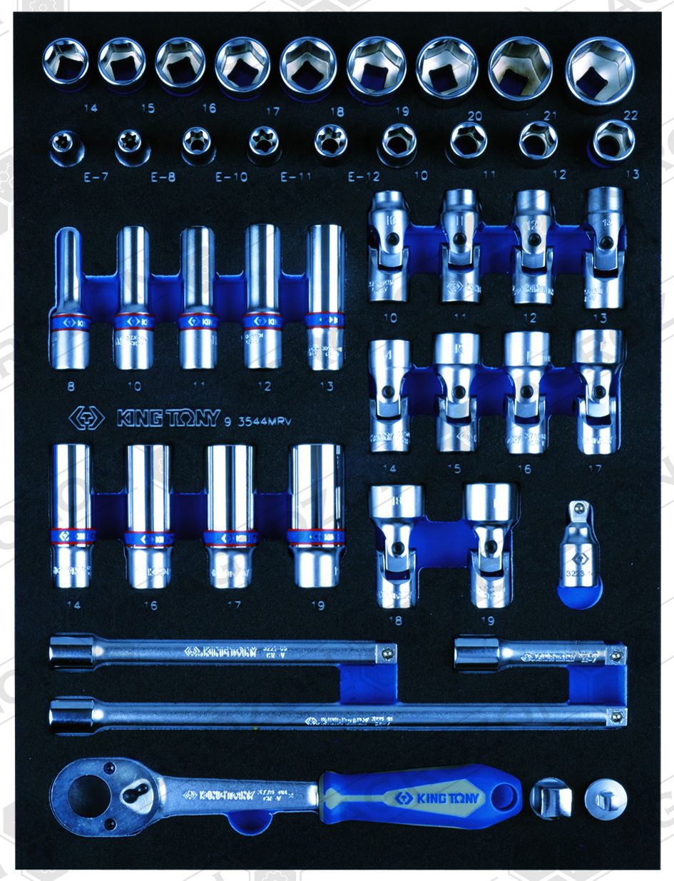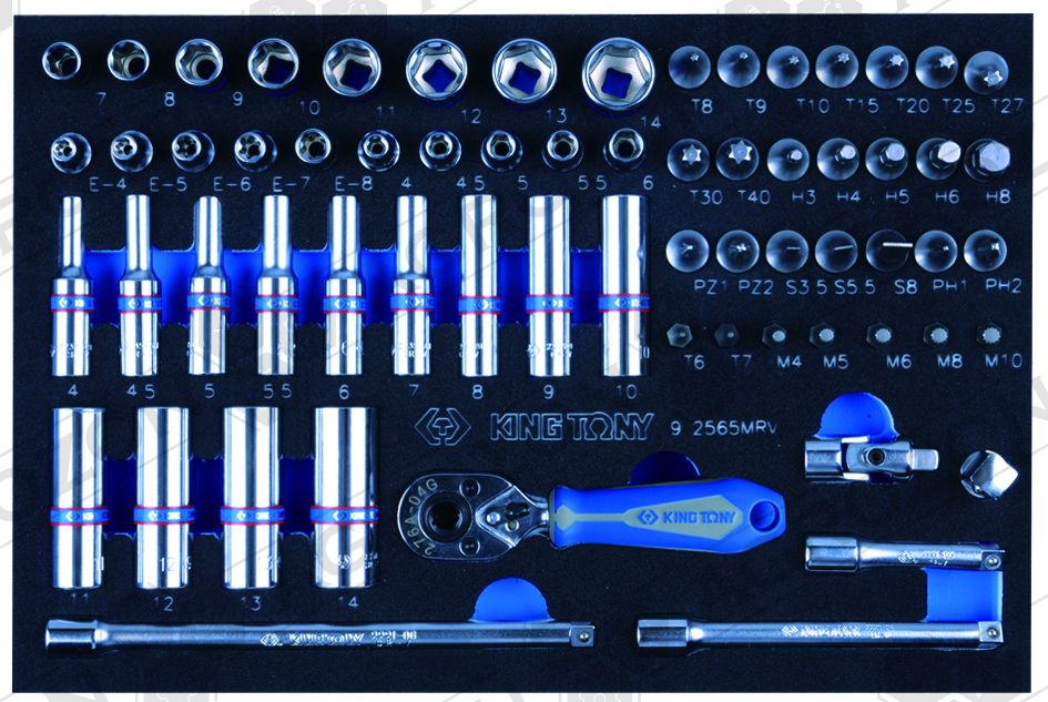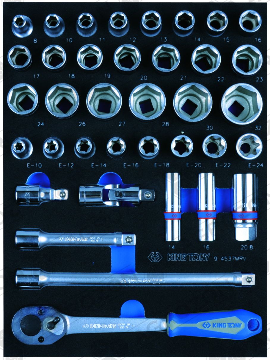 9-1220MRV Набір комбінованих ключів, ложемент, 20 предметів KING TONY 6, 7, 8, 9, 10, 11, 12, 13, 14, 15, 16, 17, 18, 19, 21, 22, 24, 27, 30, 32 мм 9-2565MRV Набір торцевих головок 1/4" з приладдям, ложемент, 65 предметів KING TONY 9-3544MRV Набір торцевих головок 3/8" з приладдям, ложемент, 44 предмети KING TONY 9-4143FRV Набір торцевих насадок, біт та ударна викрутка, ложемент, 43 предмети KING TONY 9-4537MRV Набір торцевих головок 1/2" з приладдям, ложемент, 37 предметів KING TONY 9-31124MRV Набір викруток, ложемент, 24 предмети KING TONY 9-40104GPV Набір плоскогубців та бокорізів, ложемент, 4 предмети KING TONY 9-40113GPV Набір плоскогубців, переставні кліщі та затискач, ложемент, 3 предмети KING TONY 9-90119MRV Набір накидних ключів та TORX L-подібних, ложемент, 19 предметів KING TONY