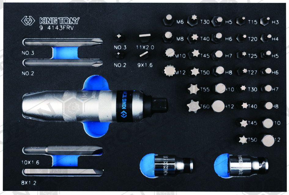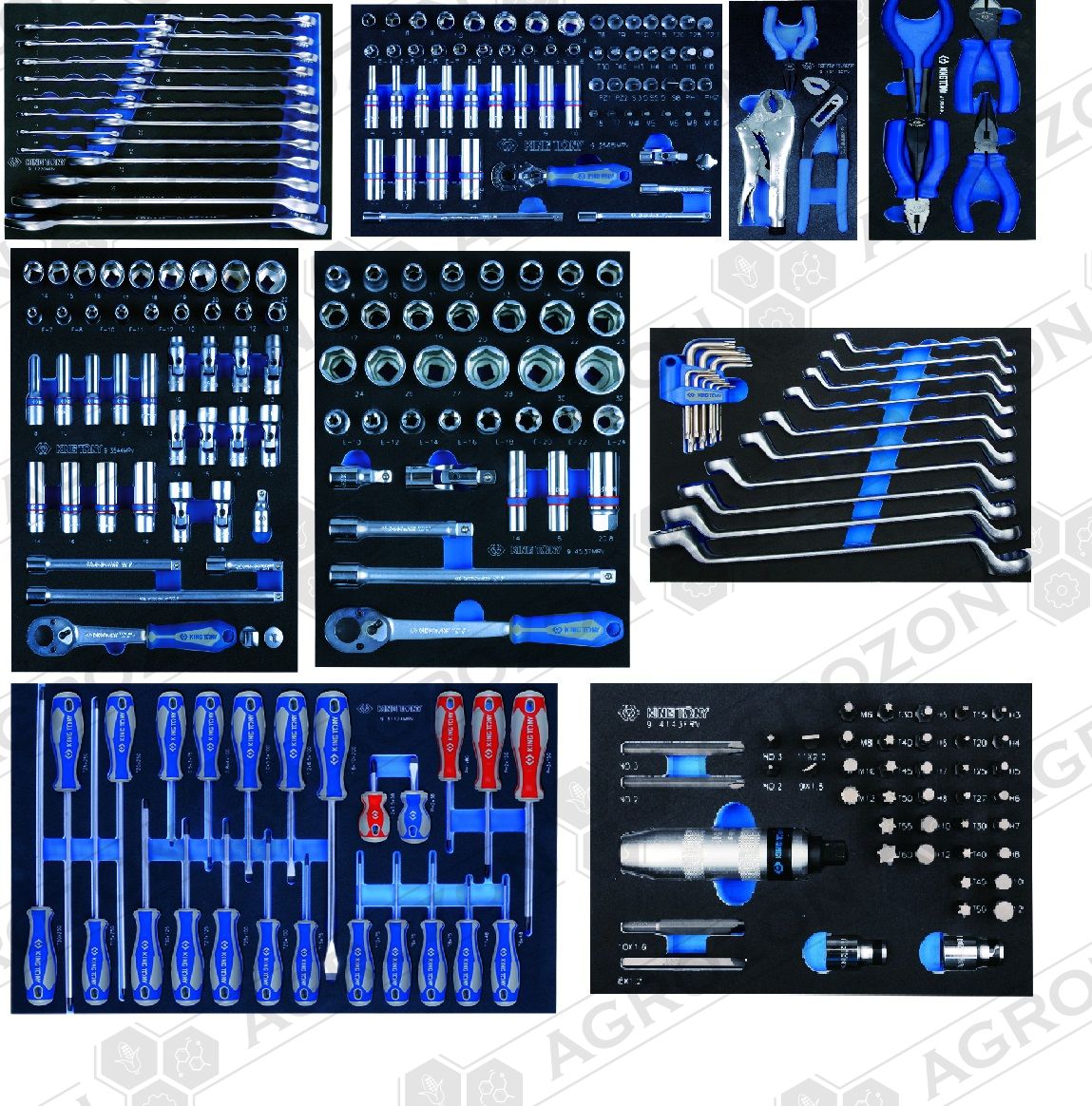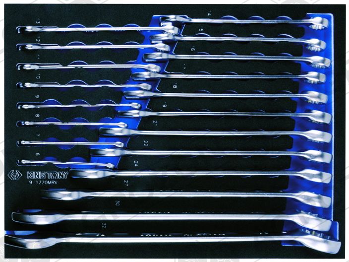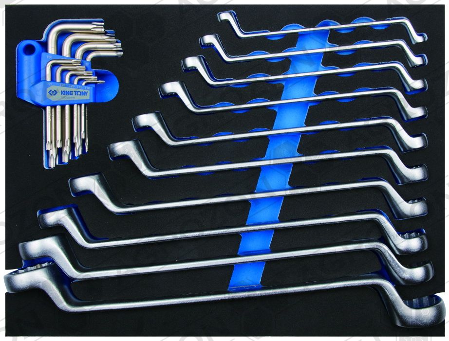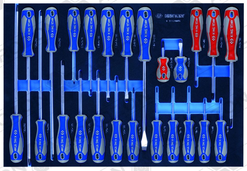 9-1220MRV Набір комбінованих ключів, ложемент, 20 предметів KING TONY 6, 7, 8, 9, 10, 11, 12, 13, 14, 15, 16, 17, 18, 19, 21, 22, 24, 27, 30, 32 мм 9-2565MRV Набір торцевих головок 1/4" з приладдям, ложемент, 65 предметів KING TONY 9-3544MRV Набір торцевих головок 3/8" з приладдям, ложемент, 44 предмети KING TONY 9-4143FRV Набір торцевих насадок, біт та ударна викрутка, ложемент, 43 предмети KING TONY 9-4537MRV Набір торцевих головок 1/2" з приладдям, ложемент, 37 предметів KING TONY 9-31124MRV Набір викруток, ложемент, 24 предмети KING TONY 9-40104GPV Набір плоскогубців та бокорізів, ложемент, 4 предмети KING TONY 9-40113GPV Набір плоскогубців, переставні кліщі та затискач, ложемент, 3 предмети KING TONY 9-90119MRV Набір накидних ключів та TORX L-подібних, ложемент, 19 предметів KING TONY