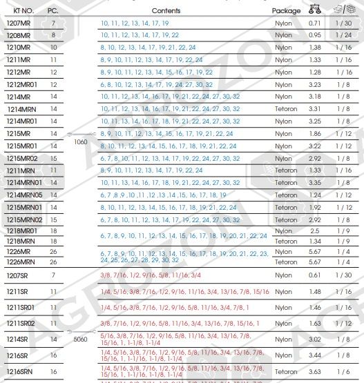 Ключі комбіновані, серії 1060 (розмір х довжина): 5/16" х 125 мм, 3/8" 145 мм, 7/16" х 155 мм, 1/2" х 175 мм, 9/16" х 185 мм, 5/8 х 20 3/4" х 235 мм, 13/16" х 255 мм, 7/8" х 265 мм, 15/16" х 285 мм, 1" х 295 мм, 1-1/8" х 315 мм, 1-1/4" х 365 мм