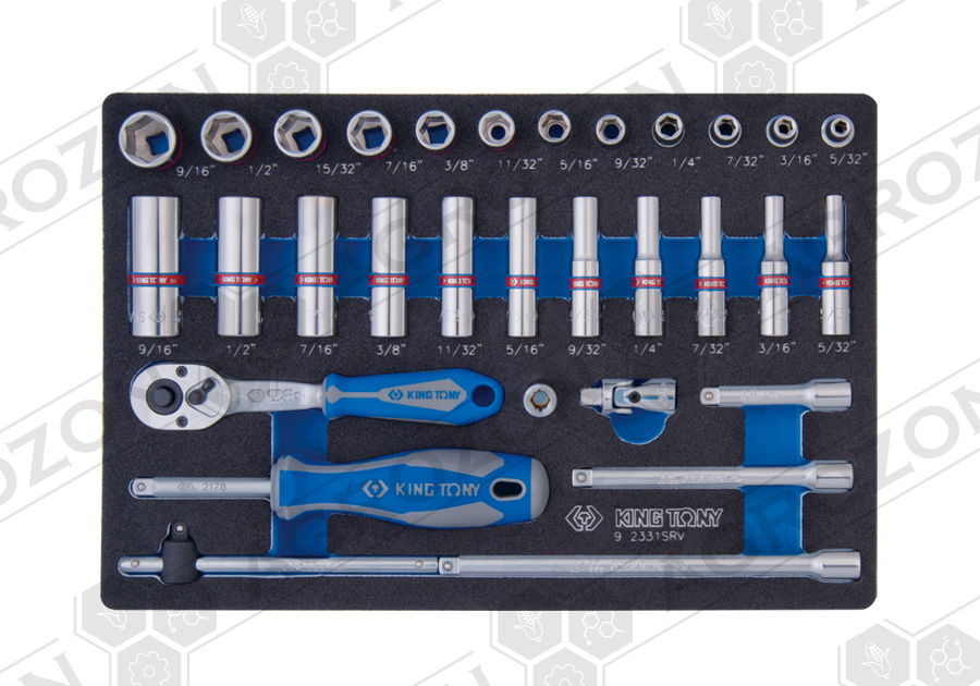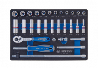Набір торцевих головок з приладдям 1/4", шестигранні, 5/32"-9/16", 31 предмет Головки та приладдя 1/4" Головка торцева стандартна 6-гранна 2335S 5/32", 3/16", 7/32", 1/4", 9/32", 5/16", 11/32", 3/8", 7/16 ", 15/32", 1/2", 9/16" Головка торцева глибока 6-гранна 2235S 5/32", 3/16", 7/32", 1/4", 9/32", 5/16", 11/32", 3/8", 7/16 ", 1/2", 9/16" Тріскачка прапорцева 2771-55G 24 зубці, 140 мм Вороток ковзний 2571-45 115 мм Викрутка воріт 2178DF 150 мм Подовжувач 2221-02 50 мм Подовжувач 2221-04 100 мм Подовжувач 2221-06 150 мм Кардан 2792 36 мм Тримач вставок (біт) 1/4" 2142 25 мм Упаковка Пластиковий (PP) футляр 820001 289 x 230 x 66 мм Ложемент EVA – 280 x 187 мм Матеріали: сталь Cr-V, хром, гума TPR, EVA (ложемент), пластик ABS Вага: 1,7 кг Призначення Передача крутного моменту від інструменту на кріплення, монтаж/демонтаж посаджених гайок та болтів. Особливості Набір укомплектований торцевими головками розмірністю дюймового стандарту: розміри виражені частинами частин дюйма. Дюймовий стандарт розмірів використовується у техніці американського виробництва. Розмір ложементу адаптований як для мобільного використання (у футлярі для зберігання та перенесення), так і для стаціонарного розміщення на полиці інструментального візка (варіант без футляра). Футляр із пластику марки ABS виготовлений та адаптований з урахуванням можливості пакетного розміщення в умовах складського зберігання чи експлуатації. Матеріал ложемента - EVA - легкий, міцний, еластичний і пружний матеріал, що володіє хорошими властивостями, що амортизують, стійкий до олій і розчинників, при деформації повертає колишню форму. EVA (ЕВА, полімер на основі етилену та вінілацетату) – матеріал, що не має рівних за своїми характеристиками та задовольняє умов інтенсивної експлуатації в умовах щоденної роботи. Галузь застосування Станції технічного обслуговування (СТО), автосервіси, автомайстерні, виробництво, побутове застосування. Інструмент KING TONY • Виготовлений із високоміцної легованої хром-ванадієвої інструментальної сталі; • Хромоване покриття захищає інструмент від корозії; • Ергономічні ручки інструментів, стійкі до дії масел, бензину, кислот та лугів; • Для надання торцевим головкам особливої міцності, в процесі виготовлення застосовано метод кування, що надає інструментам особливої міцності. Якість Відповідає вимогам міжнародного стандарту ANSI/ASME B107.1 Гарантія На ключі, торцеві головки та інший силовий інструмент поширюється довічна гарантія, що дає можливість застосування інструменту KING TONY у професійних цілях.
