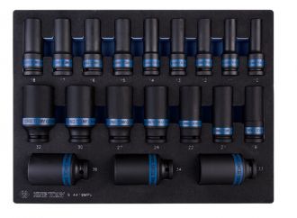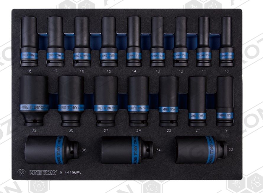 Набір торцевих головок 1/2" ударних довгих King Tony (9-4419MPV) – це комплект зі змінних насадок під інструмент, призначений для обслуговування елементів кріплення. Використовується для відкручування або закручування гайок, болтів, гвинтів, що мають 6-гранну головку. в тому, що розрахована вона на ударні навантаження, з такими головками зручно зірвати різьбу, що прикипіла або заржавіла, і виконати потужну затяжку по різьбленні. Купити набір ударних головок Кінг Тоні – найкраща ціна Комплект насадок орієнтований на автосервіс та виробництво. Постачається в ложементі EVA та розрахований на оснащення ящиків інструментальних візків розміром 579х380 мм. Набір ударних головок може бути придбаний для компонування систем зберігання інструменту, або використовуватися окремо. У комплект входять довгі ударні головки: 10, 11, 12, 13, 14, 15, 16, 17, 18, 19, 21, 22, 24, 27, 30, 32, 33, 34, 36 мм. Виготовлений інструмент із хромомолібденової сталі, захисне покриття – фосфатний потоплений. Торцеві головки можна використовувати з комірами, тріскачками і гайковертами. Для останнього інструменту передбачена канавка та отвір під кульки.