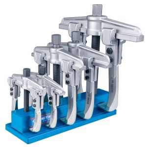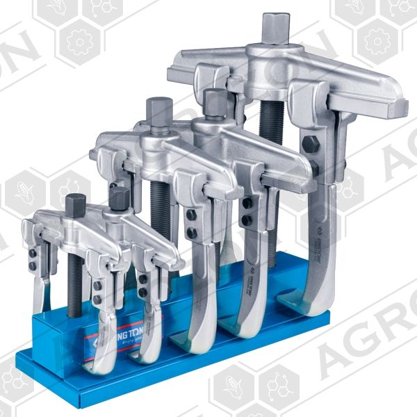Дволапі знімники King Tony призначені для демонтажу підшипників, шківів та інших деталей, запресованих в обойму або встановлених на вал. Сфера застосування: ремонт та обслуговування автомобілів, мотоциклетної та іншої техніки, промислового обладнання та ін. Інструменти виготовлені із спеціальної сталі високої якості, мають міцну конструкцію, відрізняються підвищеною надійністю та тривалим ресурсом. Інші особливості: демонтаж деталі без перекосу та з дотриманням співвісності; переставна конструкція Т-типу; посилений двотавровий профіль штанги; тягові лапи. Комплектація: знімники дволапі 90-240 мм, 3-7.5 т - 7962B-35, 7962B-05, 7962B-06, 7962B-08, 7962B-10; спеціальна підставка.
