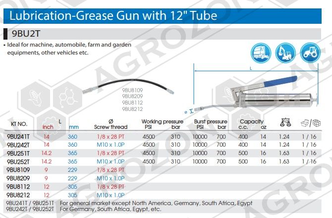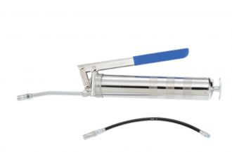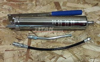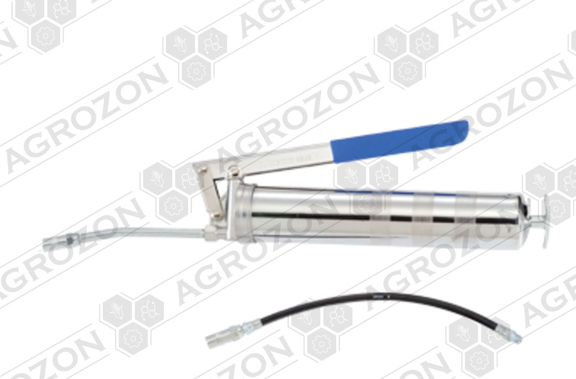 Шприц призначений для нагнітання густого мастила через прес-масляни. Застосовується в автомобільній, сільськогосподарській та інших видах промисловості для змащування вузлів та агрегатів транспортних засобів та техніки. Мастило проводиться за допомогою нагнітання плунжером невеликої кількості мастила. Мастило подається з основної ємності шприца, попередньо заправленим мастилом ручним способом або спеціальним картриджем. Робота проводиться двома руками – тримаючи однією рукою корпус шприца, другою рукою, натискаючи на важіль, нагнітає мастило. Що входить в комплект: Шприц 1 шт Жорстка насадка 1 шт Гнучкий шланг 1 шт Наконечник для прес-масляни 2 шт Технічні характеристики Довжина, мм 360 Об'єм для мастила, мл 400 Номінальний тиск, бар 310 Максимальний тиск, бар 700 Різьблення шлангу (наконечників) 10 мм х 1.0 мм Вага, гр 1240