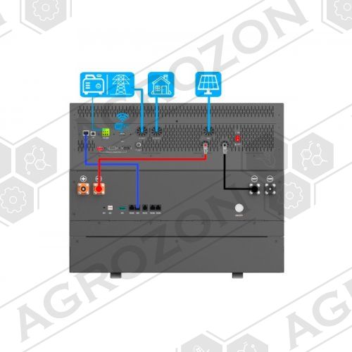 - Зарядка від сонячної батареї і змінного струму: тип підключення до сонячної батареї MPPT, максимальна потужність сонячних панелей 6000 Вт, MPPT діапазон напруги - 150-430 В (постійний струм), максимум при розімкненому ланцюгу - 450 В (постійний струм). Максимальний вхідний змінний струм - 27 А, максимальна сонячна зарядка змінним струмом 100 А, максимальна зарядка змінним струмом - 80 А, максимальний зарядний струм - 100 А.